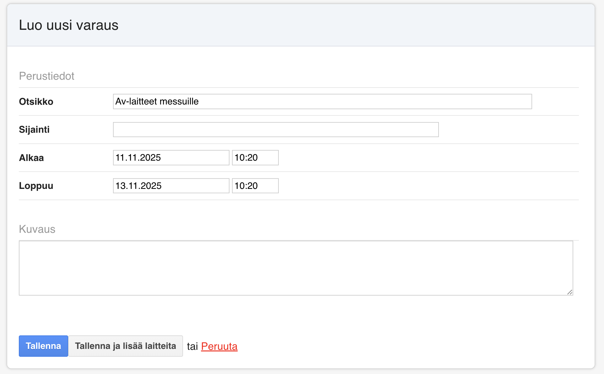 💡 Jos haluat lisätä varauksen toiselle käyttäjälle, varmista että kenttä “Varaaja” on otettu käyttöön kohdasta Hallinta → Yleisasetukset → Varaukset.