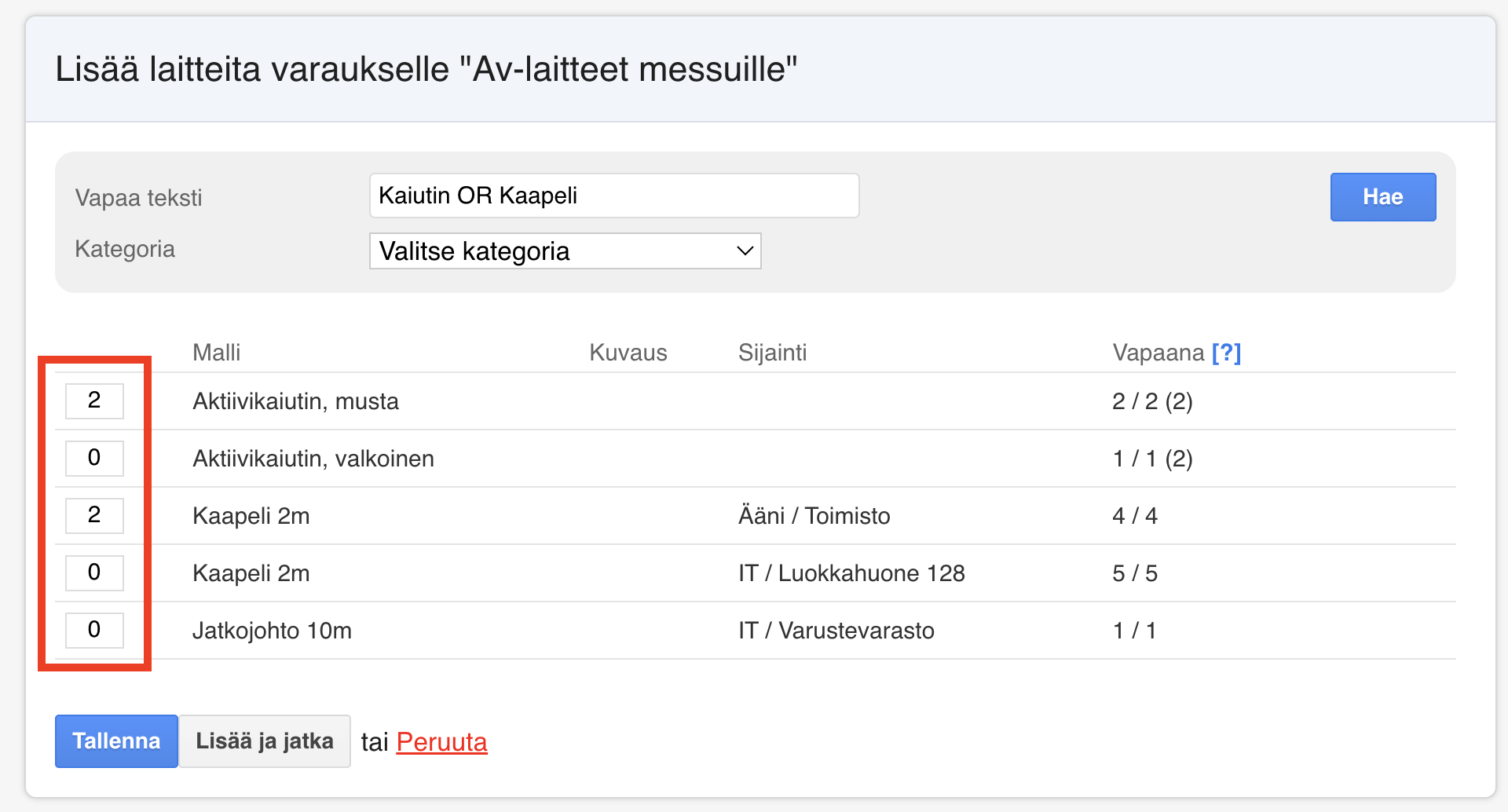 - Mallilista näyttää kuinka monta laitetta on vapaana valitsemallesi ajankohdalle