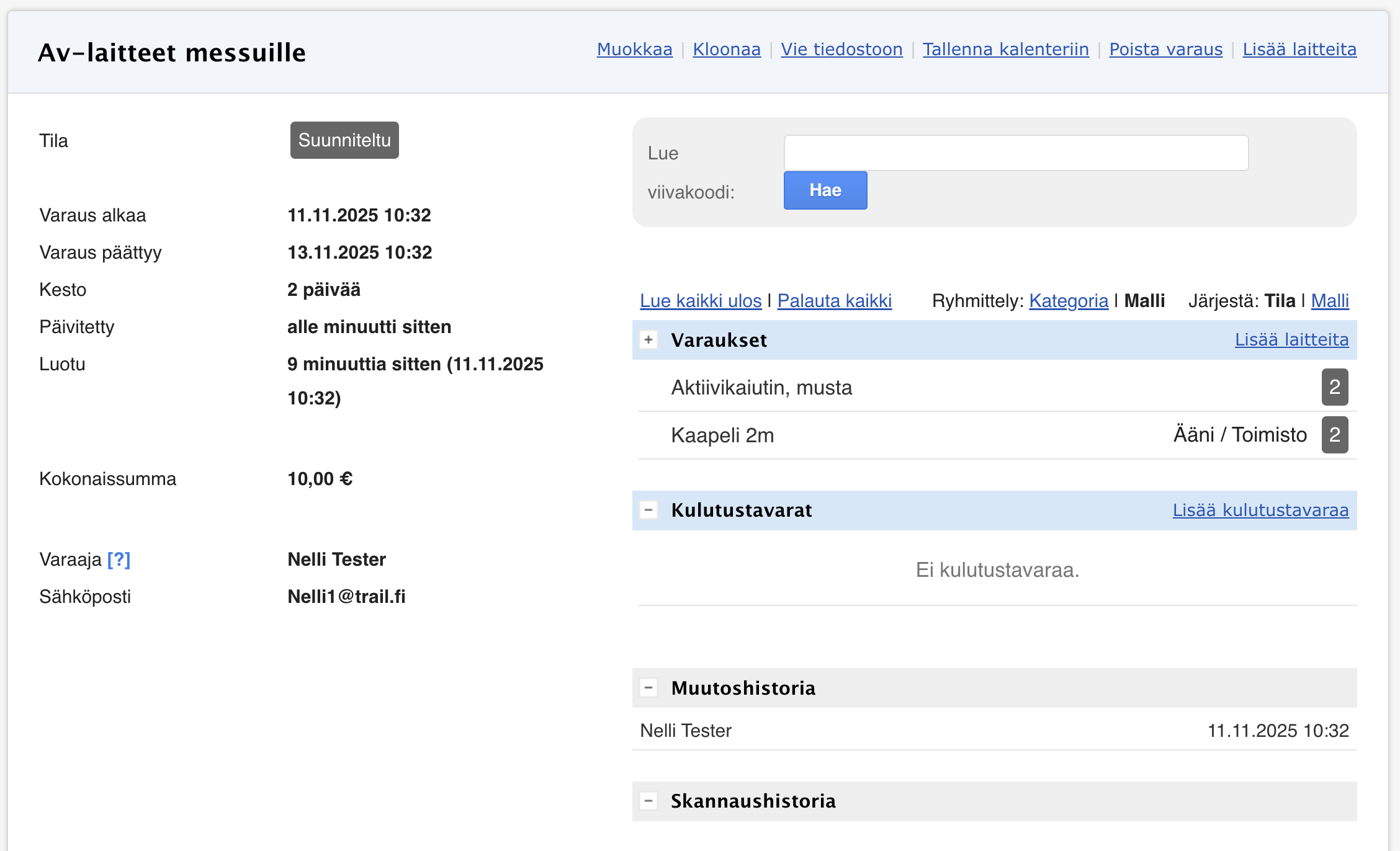 - Seuranta: mikäli varaaja ei palauta laitteita päättymispäivään mennessä, lähtee varaajalle muistutus (lisäasetus).