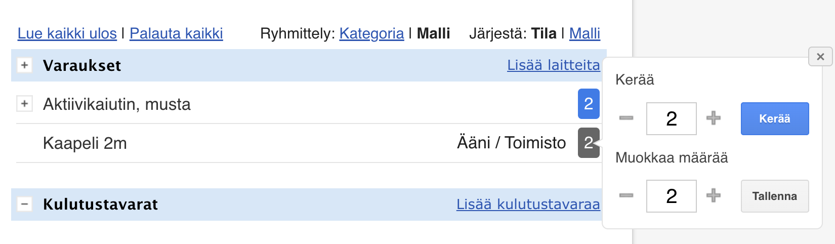 - Suunnittele mitä laitteita tarvitaan usein samankaltaisissa varauksissa. Varauspaketti nopeuttaa uusien varausten tekemistä ja varmistaa, ettei mitään tärkeää unohdu.
