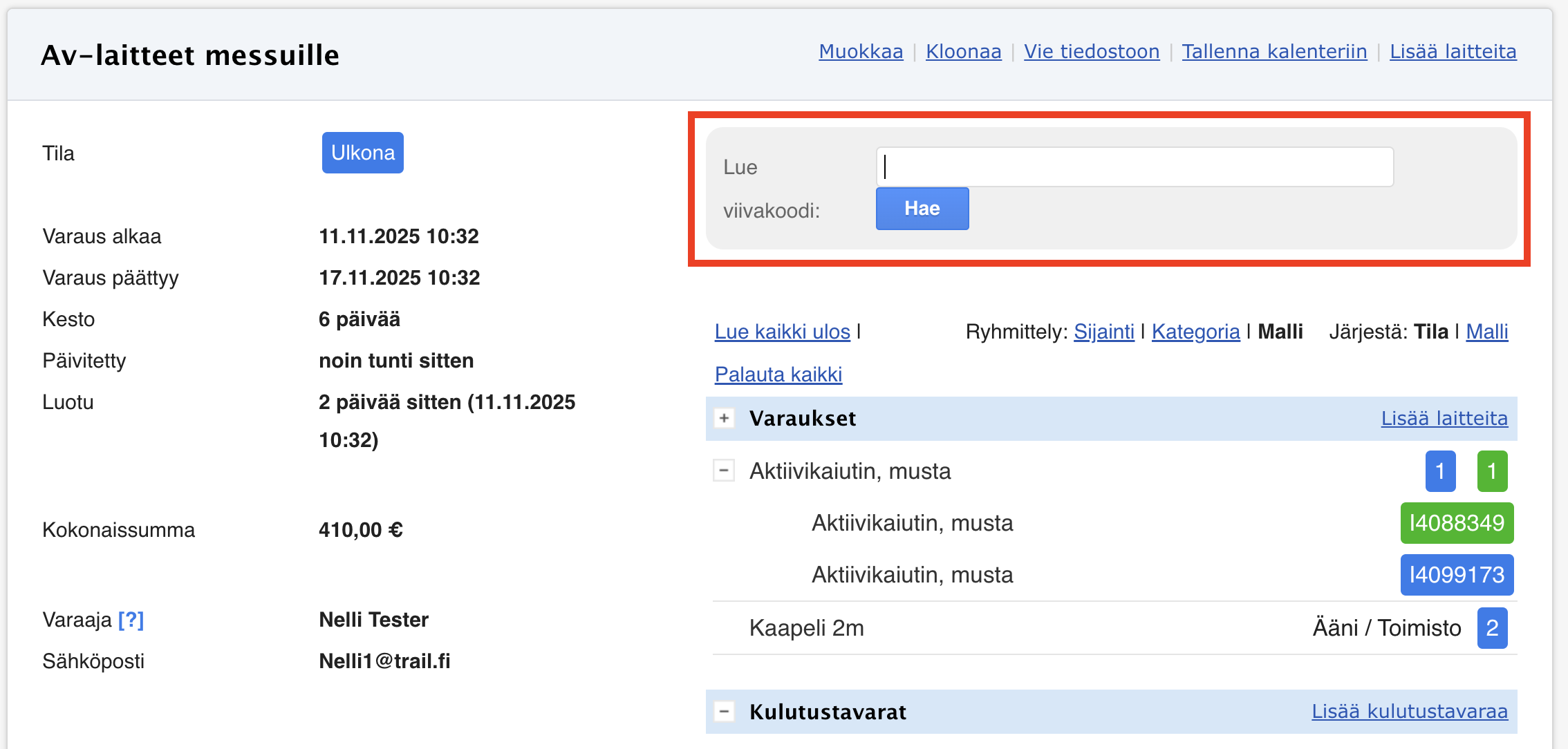 - Skannaa tuotteiden QR- tai viivakoodi (Trail-tarra) kenttään Lue viivakoodi.