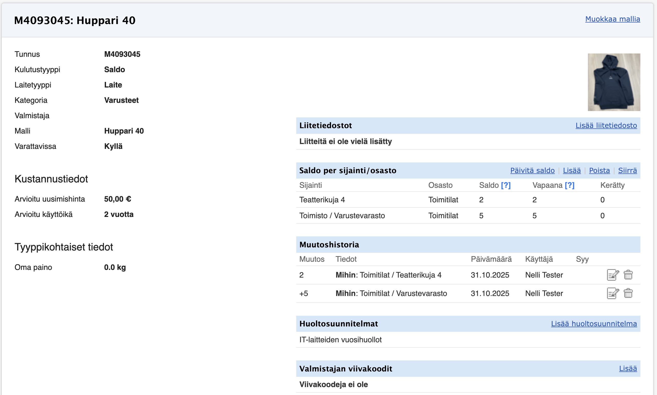 Tuote näkyy laitekortilla, ja saldomallin kortilla.