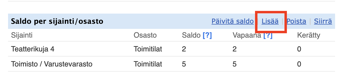 - Sijainti: missä saldo fyysisesti on. Joko fyysinen sijainti tai laite.