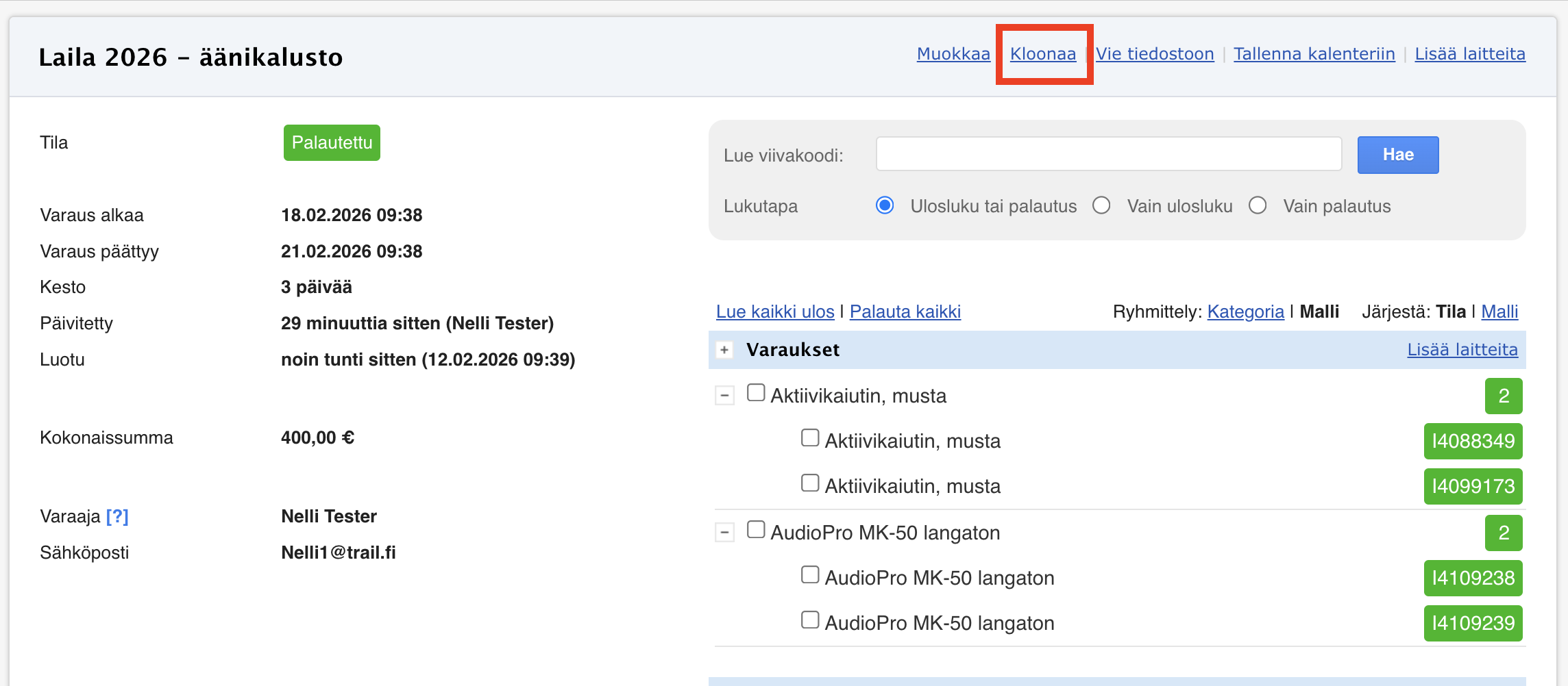 - Klikkaa Kloonaa-painiketta varauksen oikeasta yläkulmasta.