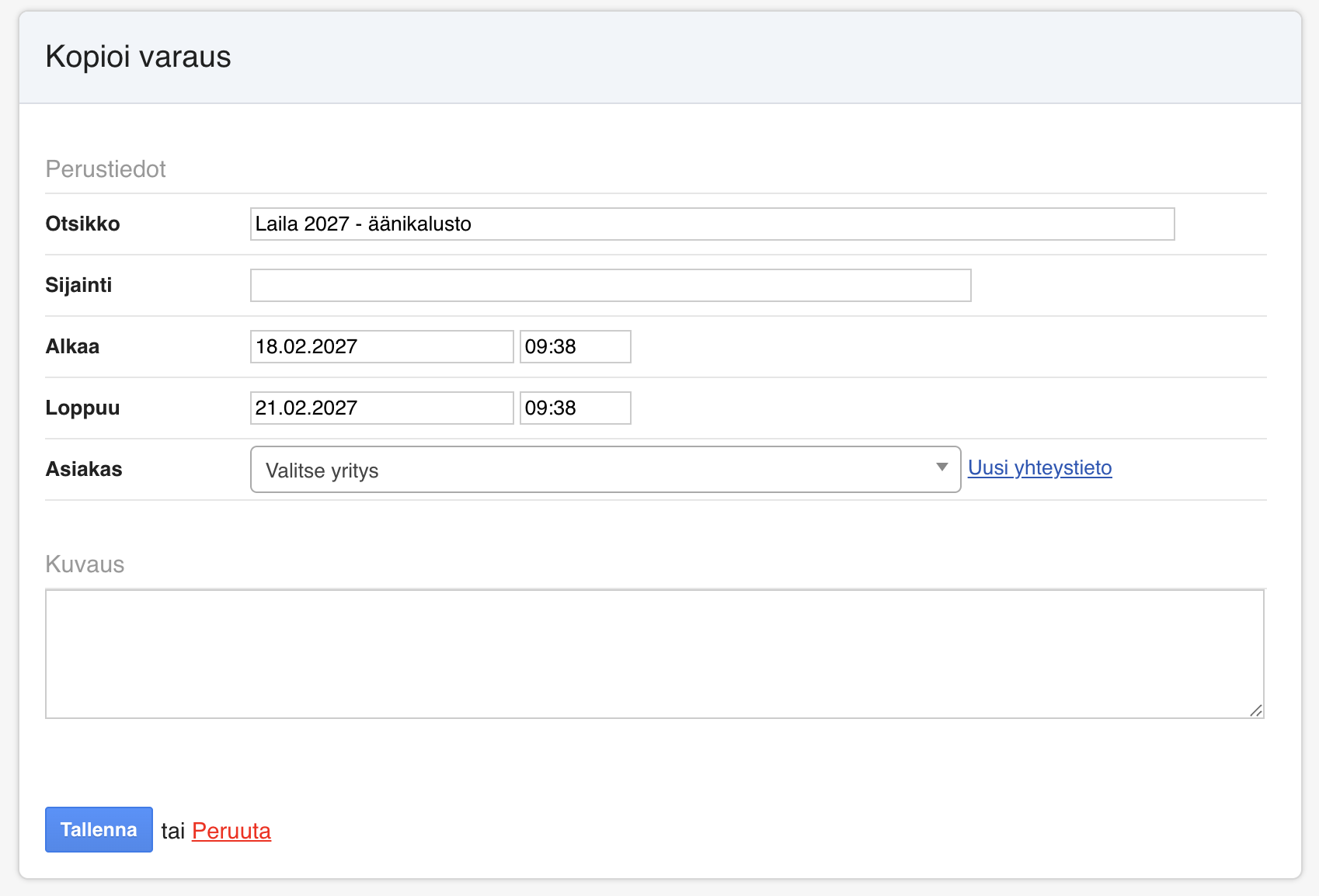 Mitä varauksen kloonaus tarkoittaa? Voit luoda uuden varauksen valmiin varauksen pohjalta. Tämä on hyödyllistä silloin, kun teet samantyyppisiä varauksia useaan eri ajankohtaan ja tarvitset samoja laitemalleja ja kappalemääriä.