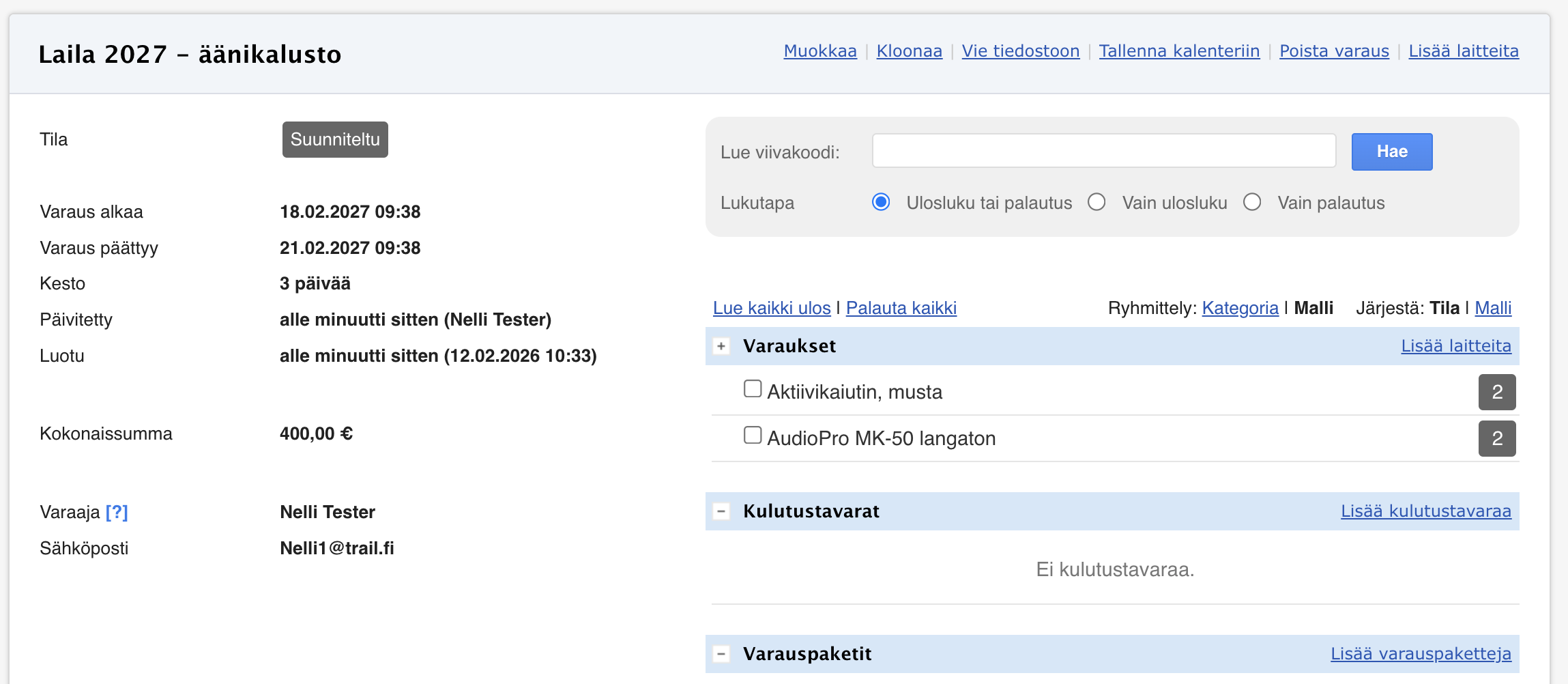 - Laitemallit ja kappalemäärät on lisätty automaattisesti uuden varauksen pohjaksi.