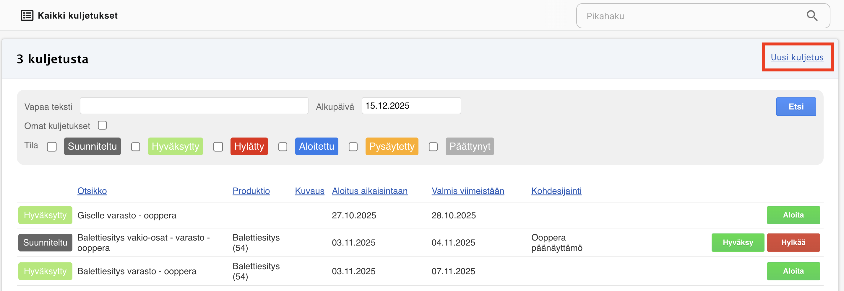 - Uusi kuljetus on nyt luotu ja näkyy Kuljetukset-listauksessa!