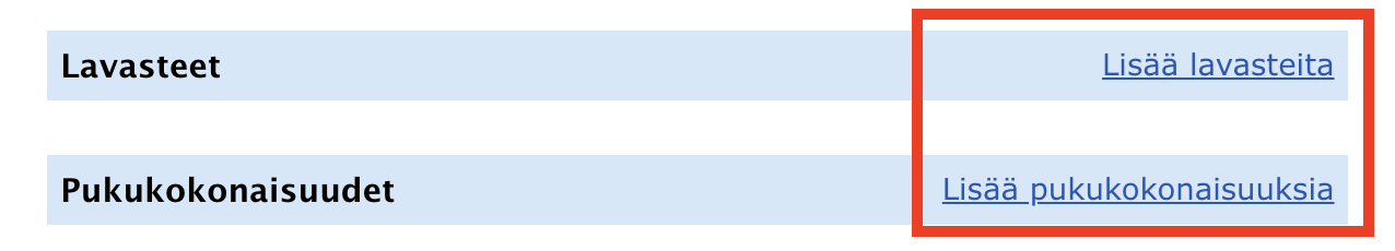 - Lavasteet / Pukukokonaisuudet / Tarpeistokokonaisuudet