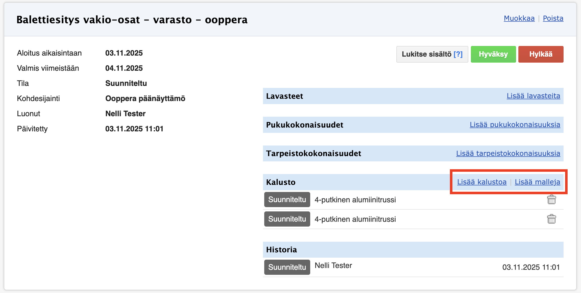 Kun kalusto on saapunut kohteeseen (esimerkiksi ulkovarastolta näyttämölle), voit merkitä käytön aloittamisen varauksen tietoihin: