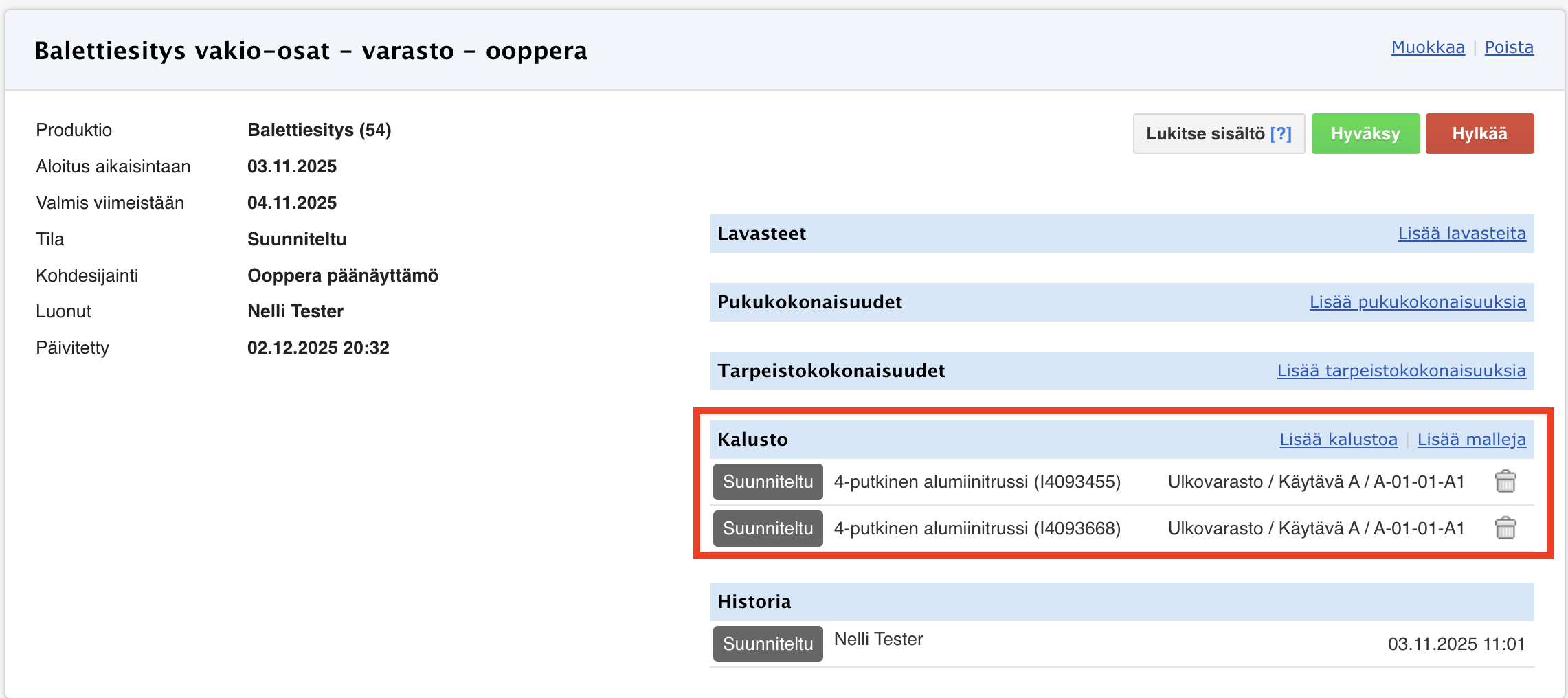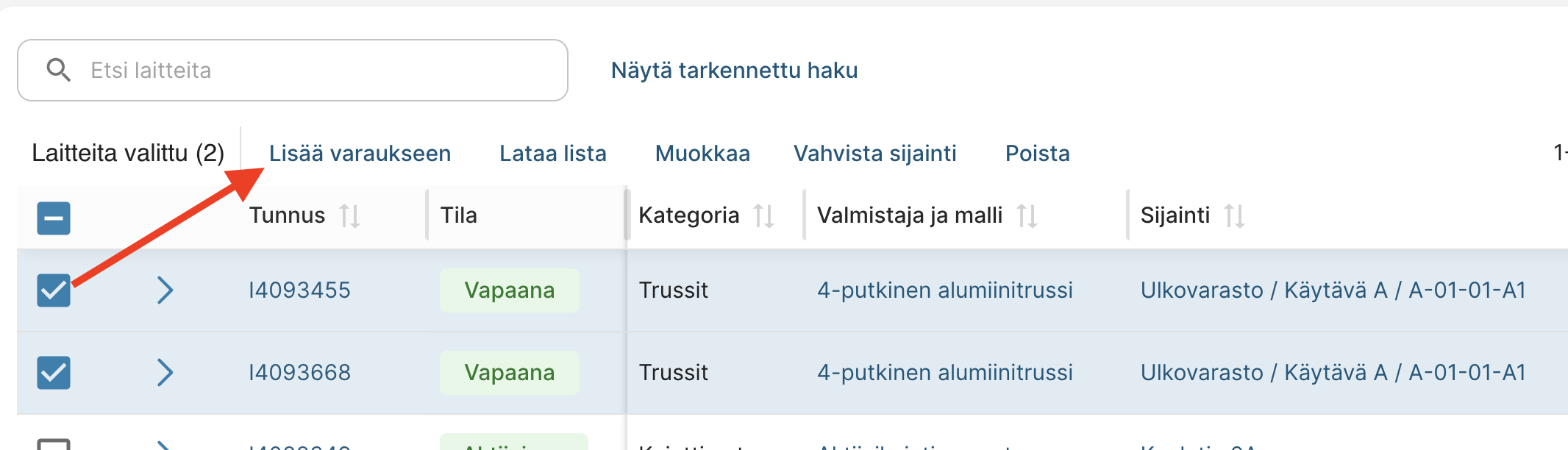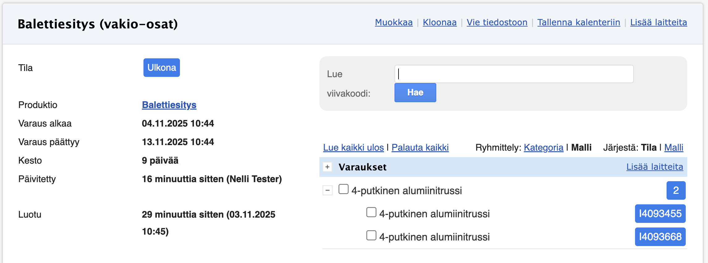 Huom! Jotta laitteet voidaan lisätä kuljetukseen varauksen näkymästä, tulee varauksessa näkyä tarkat yksilöt. Kaluston lisääminen onnistuu myös silloin, jos laitteet ensin luetaan varaukseen ulos ja sen jälkeen merkitään kuljetukseen.