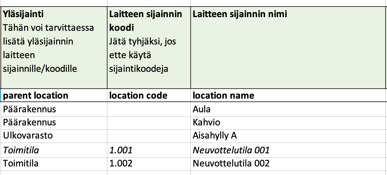 - Esimerkki: Parent location = Rakennuksen nimi, Location name = huone rakennuksessa.