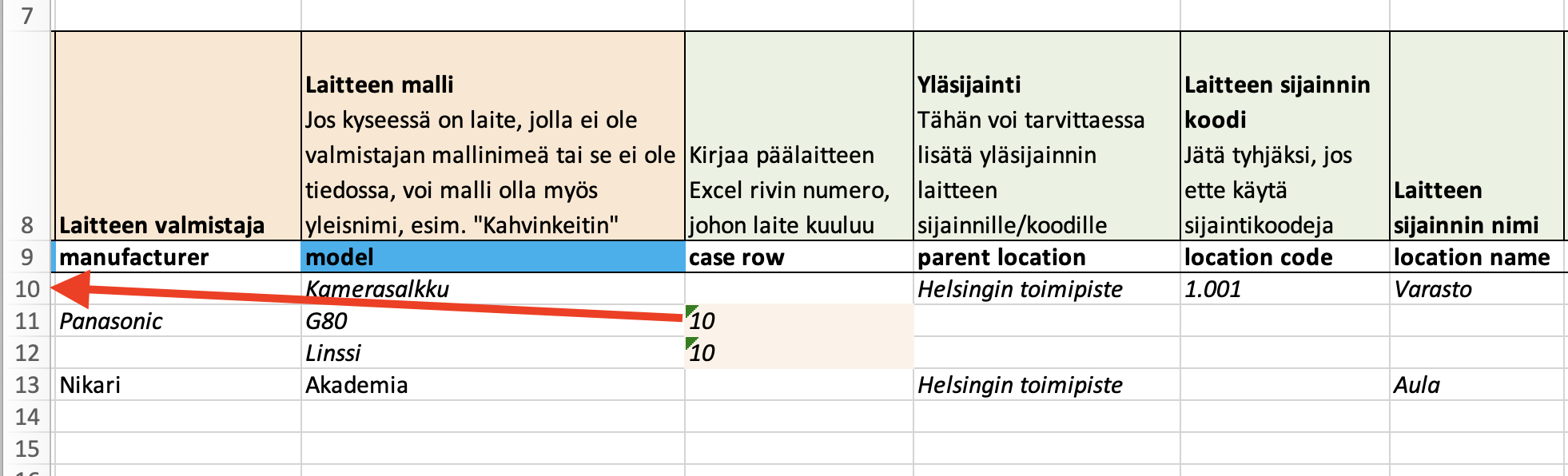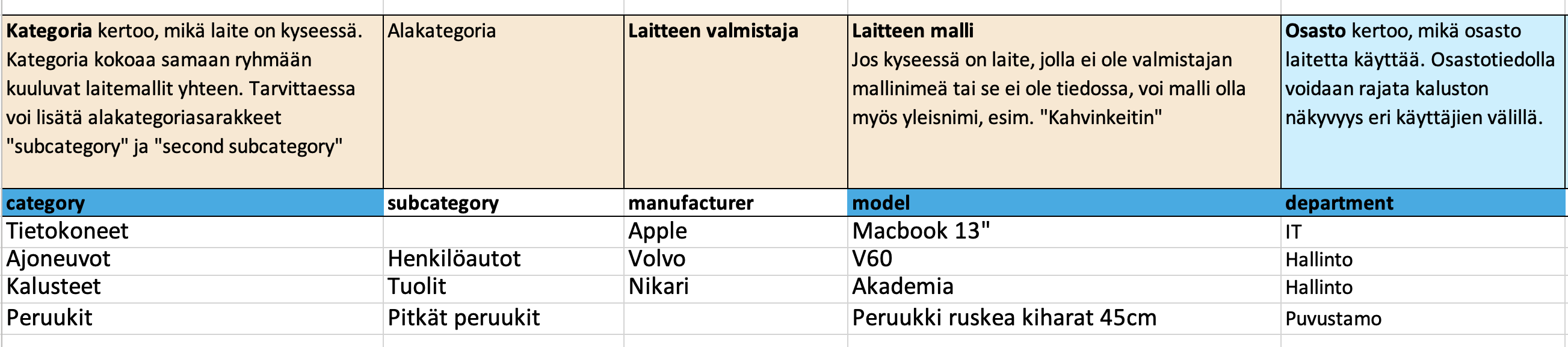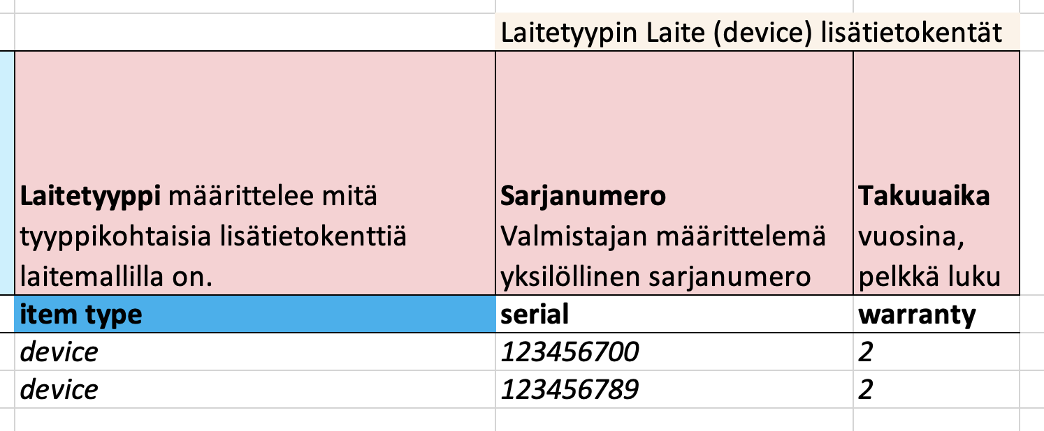 - Jos käytätte sarjanumeroita tai muita yksilöllisiä tunnisteita, jokainen laite tulee lisätä omalle riville.