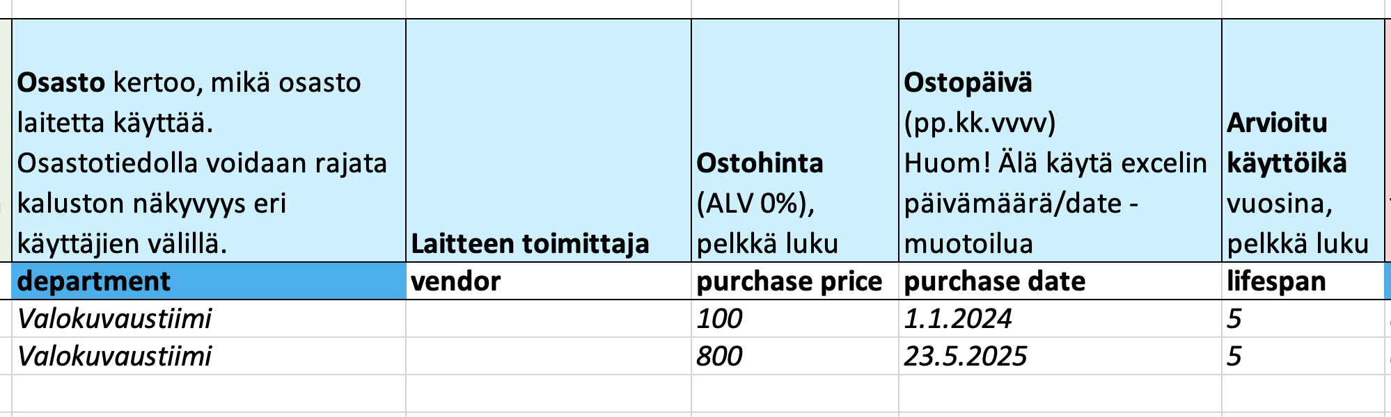 Tämän ohjeen avulla opit täyttämään Excel-vientitaulukon niin, että uudet laitteet tulevat oikein järjestelmään.