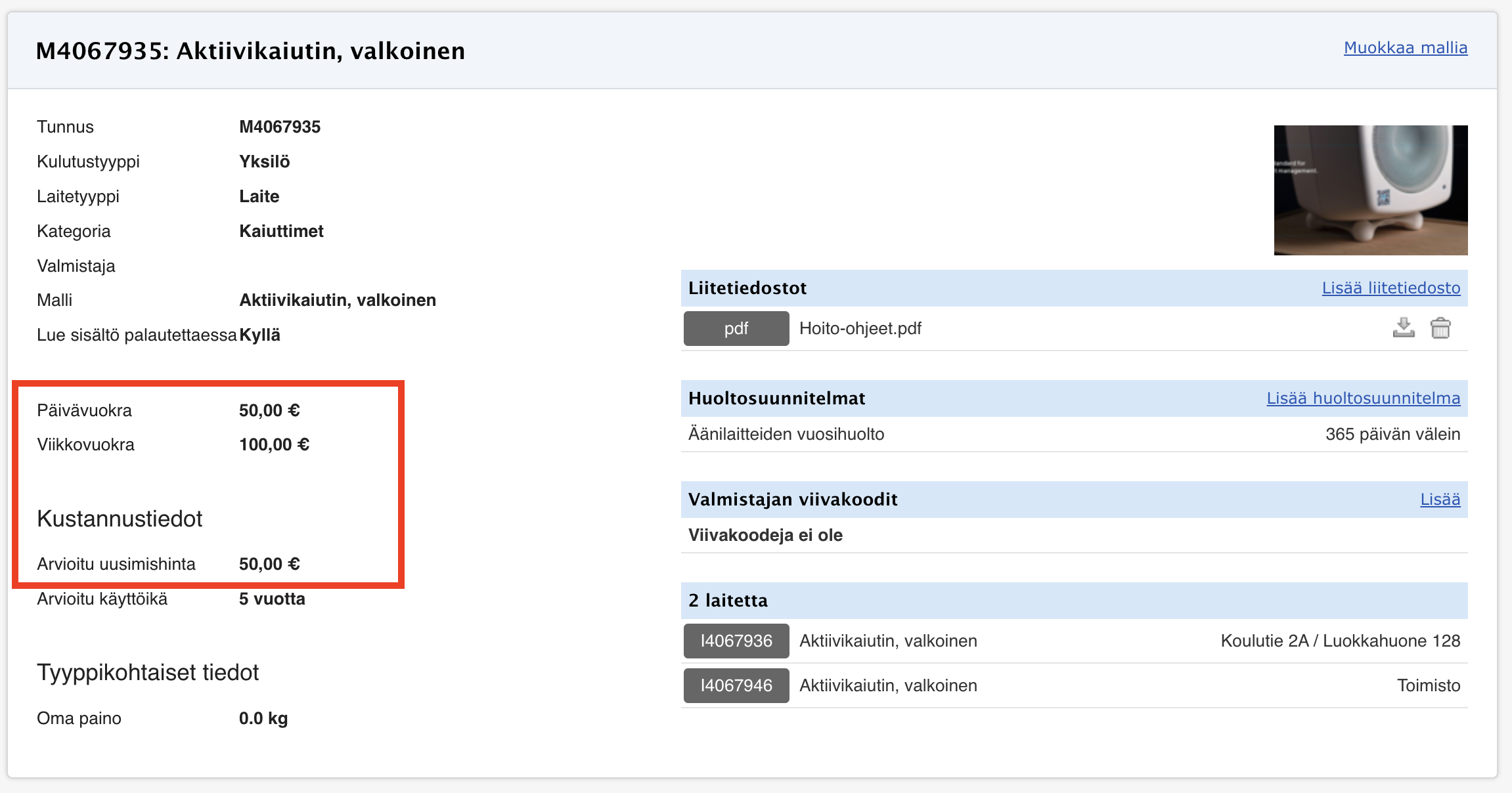 Riippuen onko vuokratyypiksi valittu mallikohtaisesti, tai prosentteina, määrittele tarvittavat lisätiedot kullekin mallille. Jos mallille ei ole asetettu tarvittavia hintoja, järjestelmä ei voi laskea vuokrahintaa.