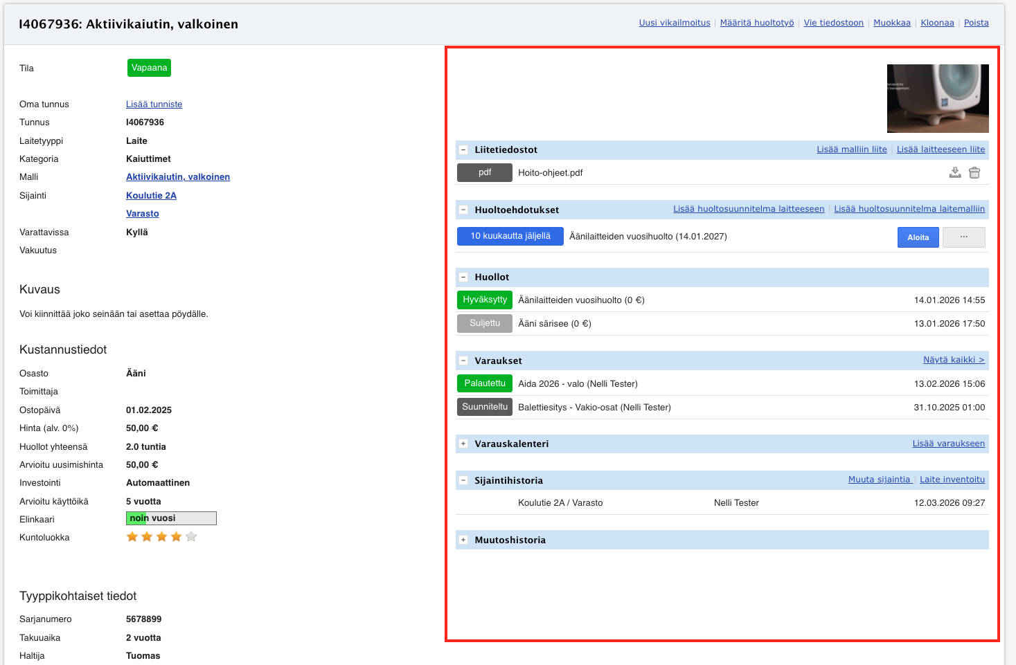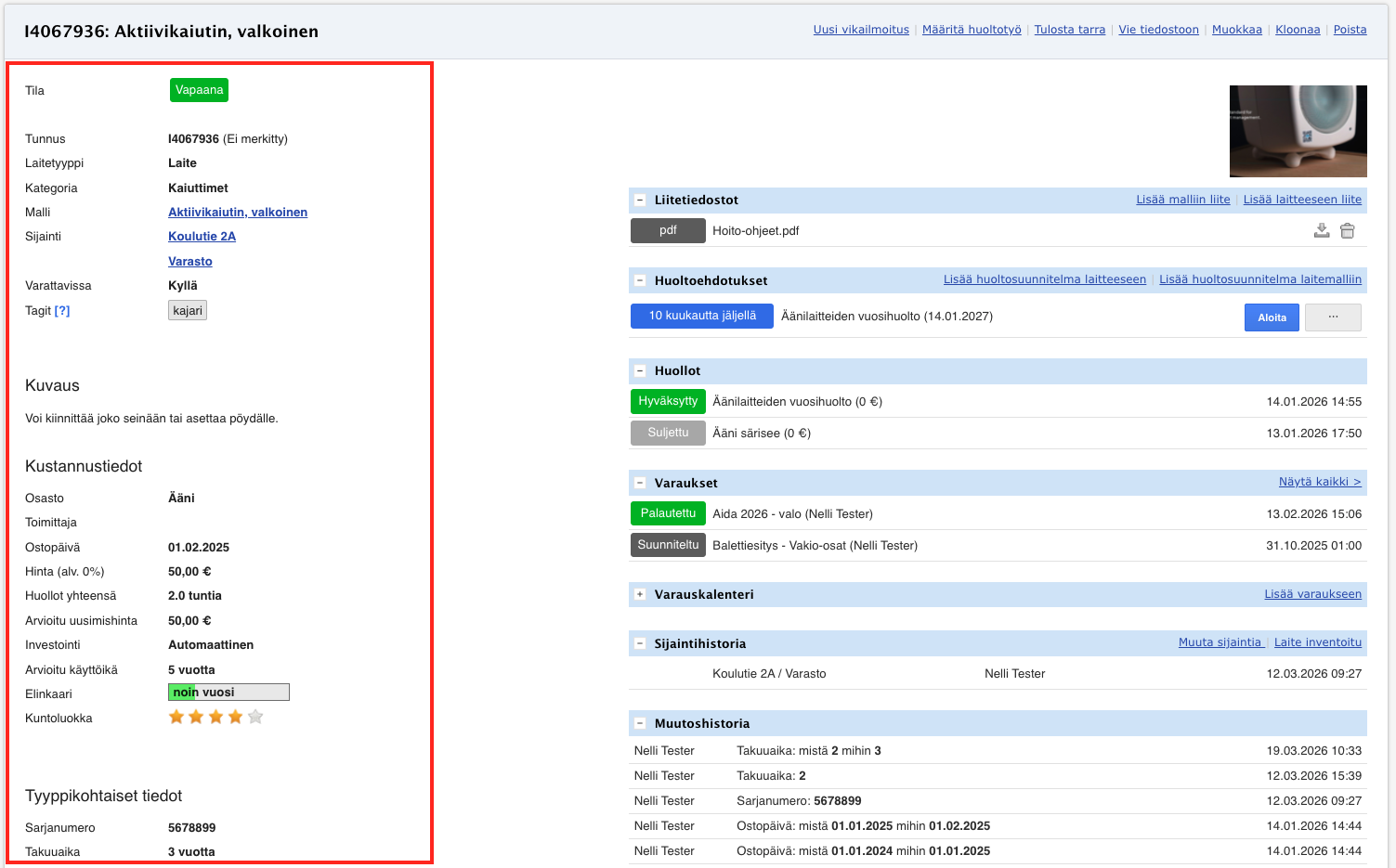 - Elinkaari - Järjestelmä laskee laitteen elinkaaren ostopäivän ja arvioidun käyttöiän perusteella. Tämä auttaa ennakoimaan laitteen uusimistarvetta.