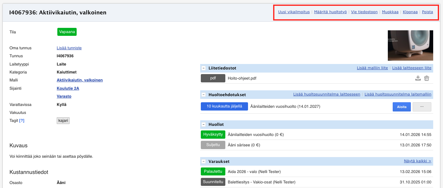 - Yleiset tiedot - Sisältää laitteen perustiedot, kuten kategorian, sijainnin ja varattavuustiedon.