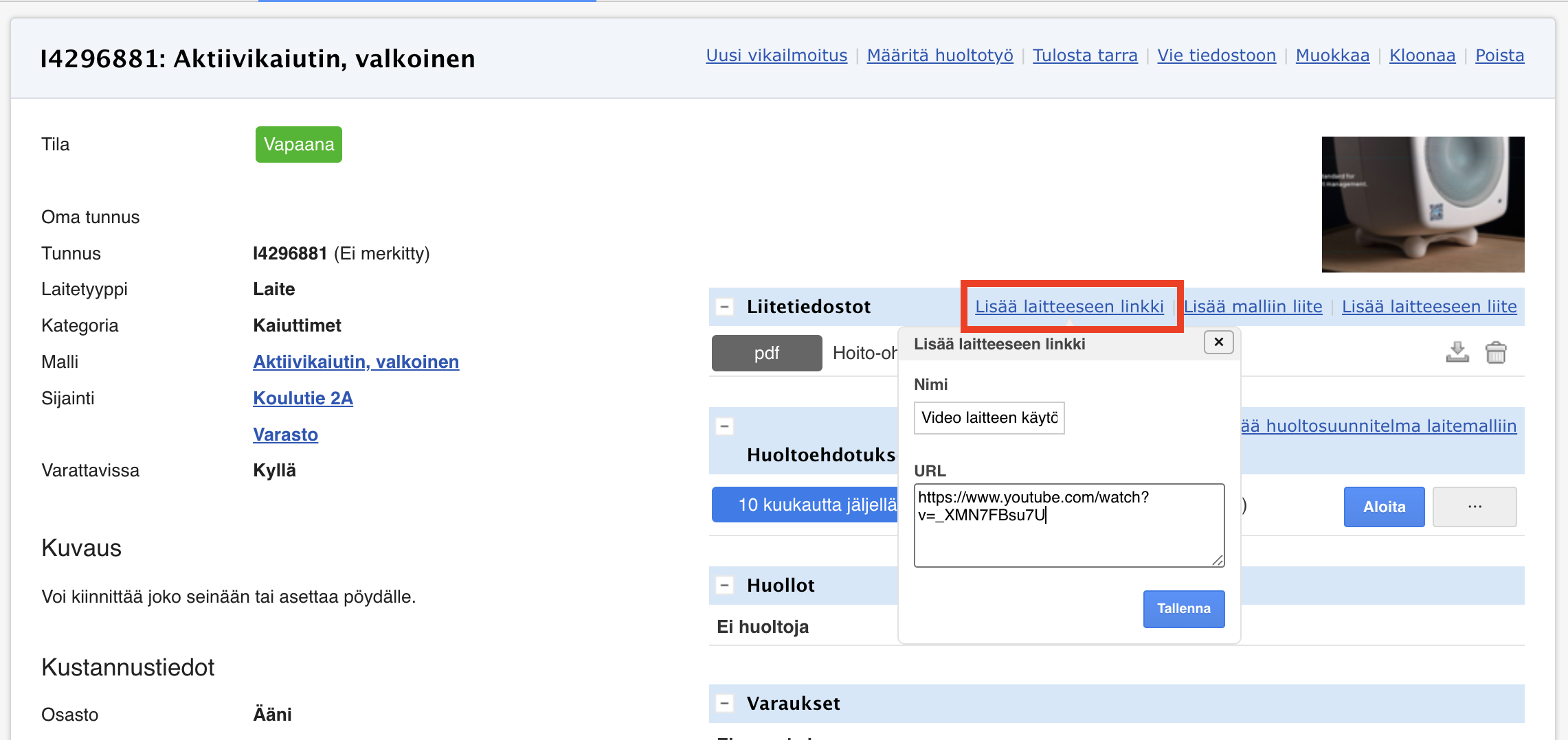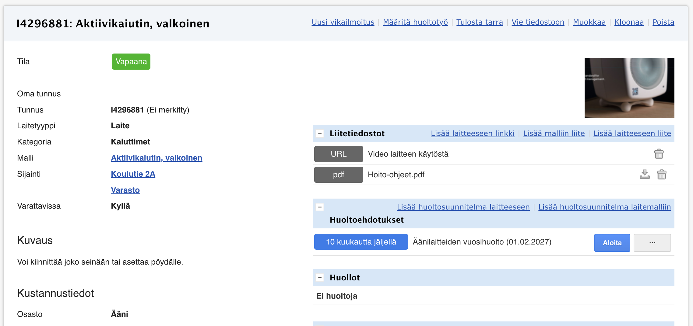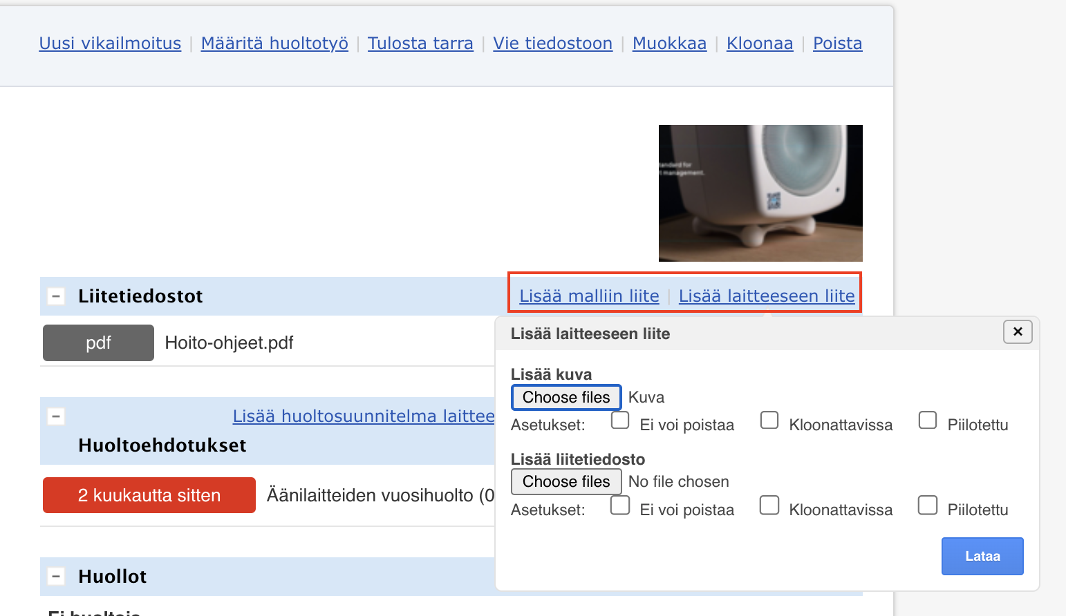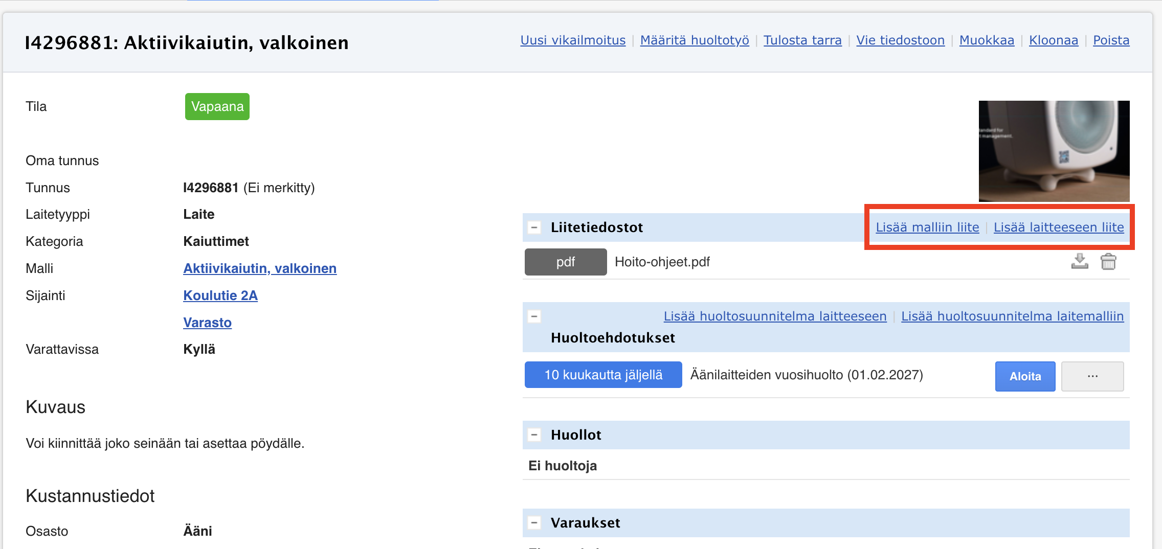 Liitetiedostojen avulla voit rikastaa laitteiden ja laitemallien tietoja esimerkiksi kuvilla, hoito-ohjeilla ja käyttöohjeilla. Tämä helpottaa laitteiden tunnistamista, käyttöä ja ylläpitoa.