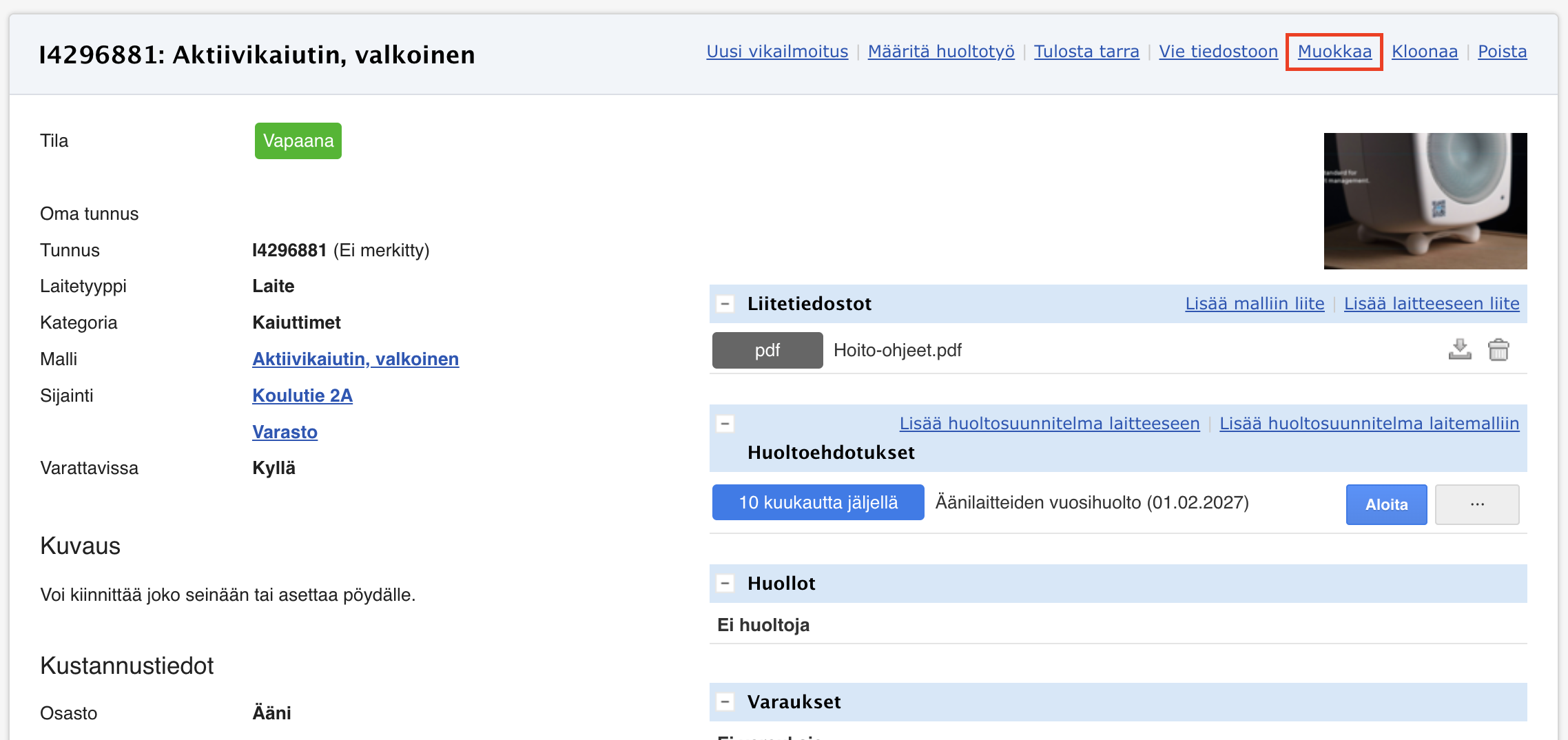 - Muokkausnäkymä avautuu. Näkymästä voit päivittää laitteen tietoja