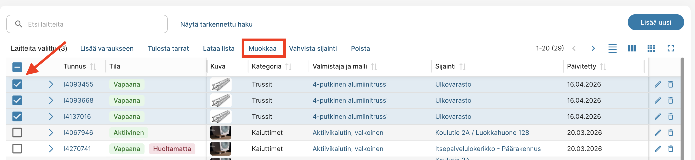 - Massamuokkaus koskee vain tiettyjä yleisiä kenttiä, kuten osasto, sijainti, varattavuus ja kustannustiedot. Muut tiedot tulee muokata suoraan laitekortilta.