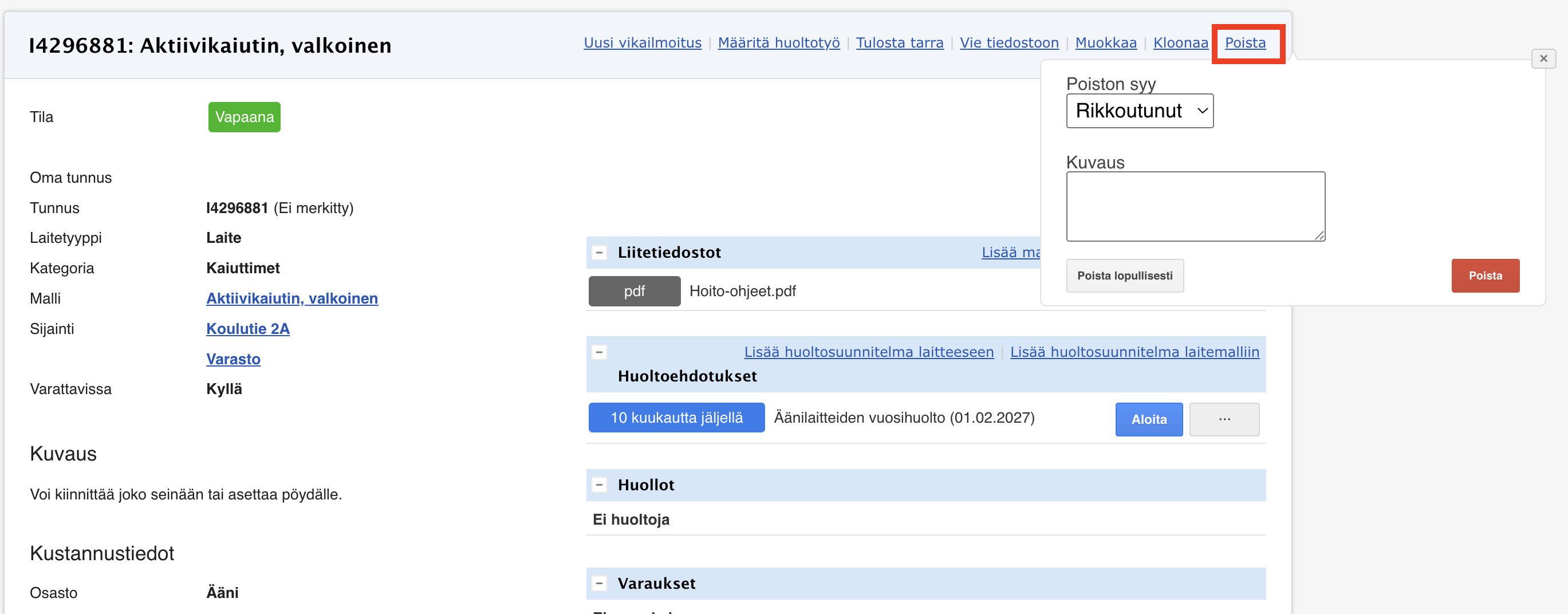 - Valitse poistolle syy ja lisää tarvittaessa lisätietoa