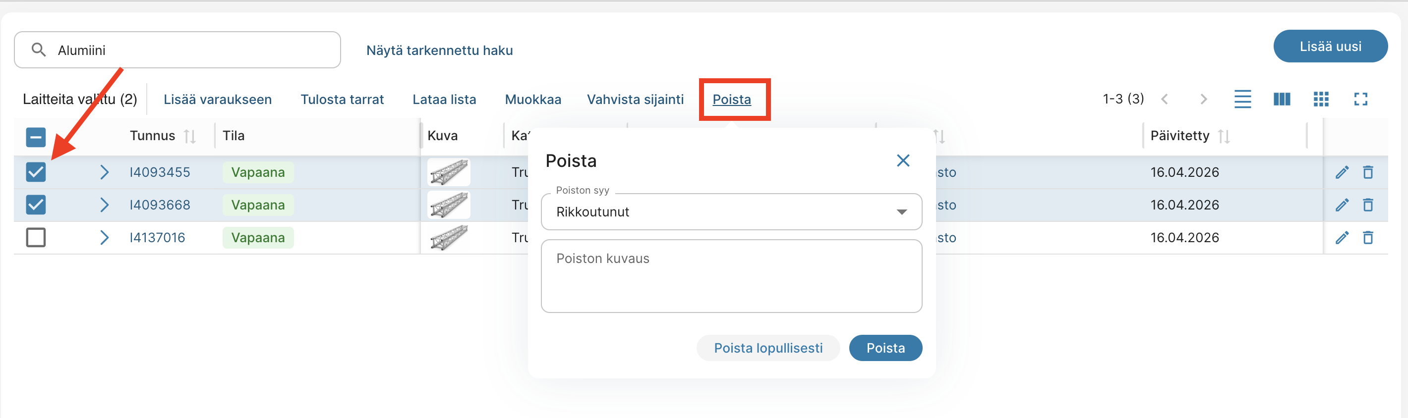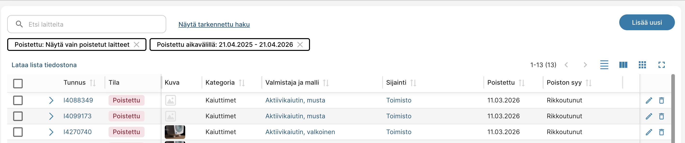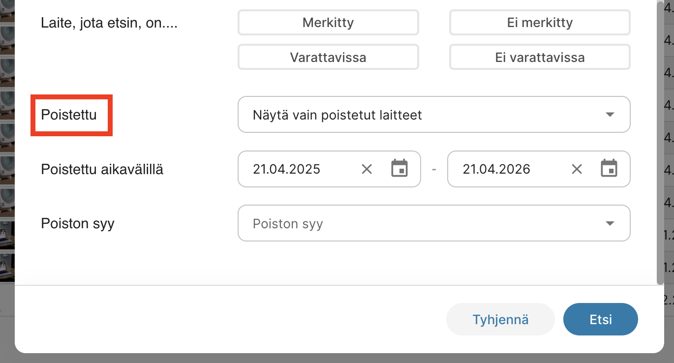 Voit lisätä laitelistaan sarakkeet Poistettu ja Poistosyy: