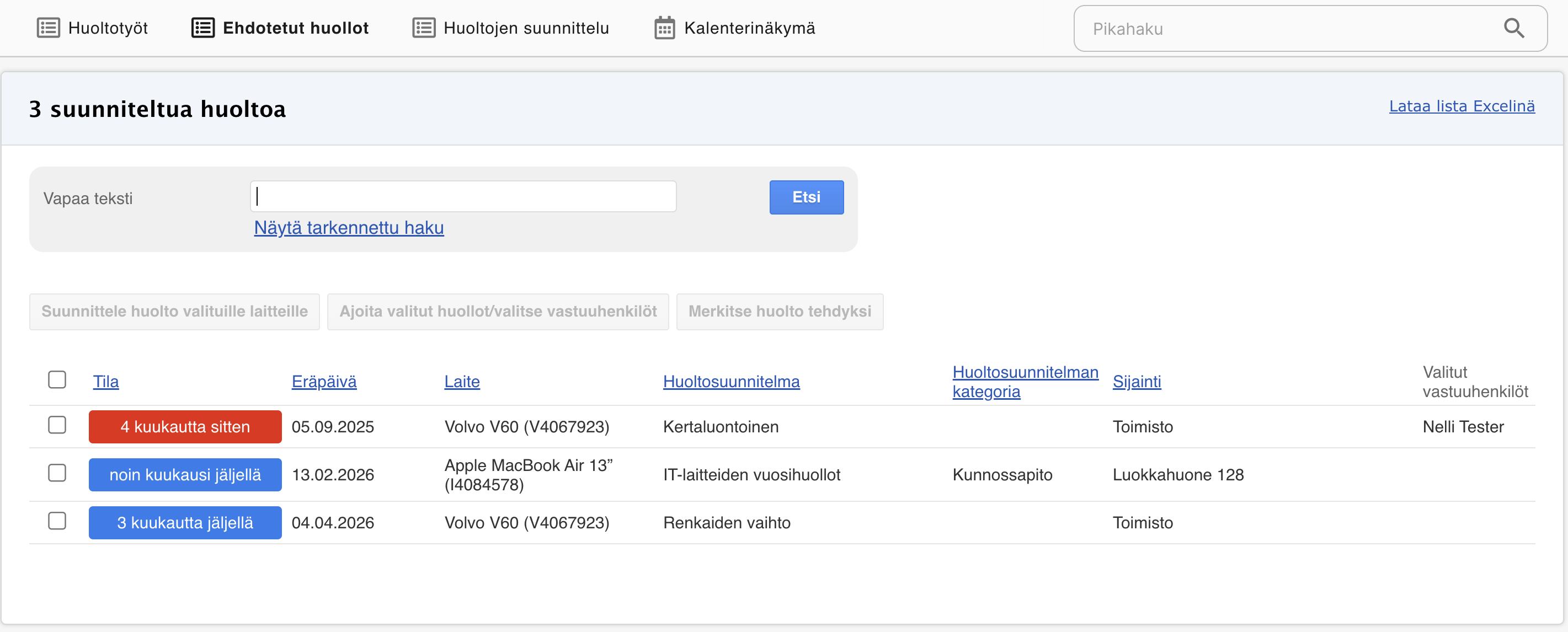 - Seurata tulevia määräaikaishuoltoja (näyttää oletuksena myöhässä olevat, sekä tulevan kolmen kuukauden määräaikaishuollot)