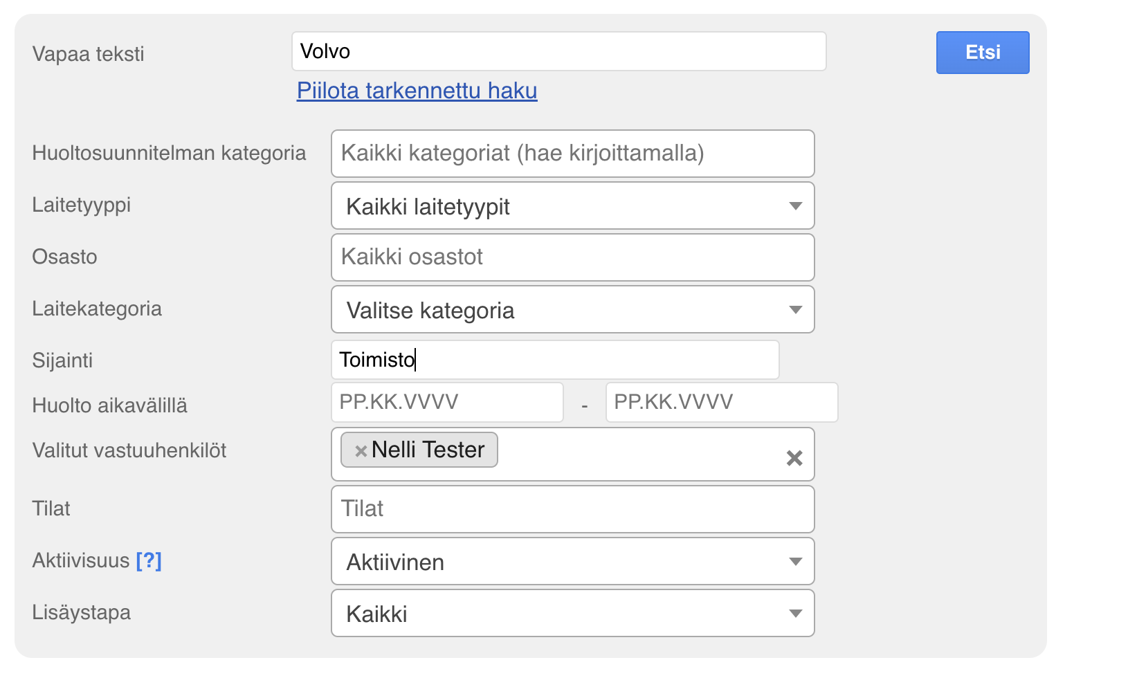 - Suosittelemme käyttämään tarkennettua hakua, jos huoltojen määrä on suuri – näin löydät helposti oikeat huollot.