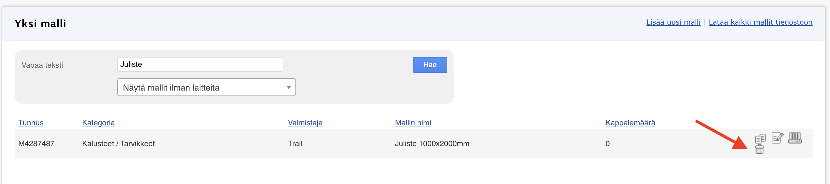 - Klikkaa mallirivillä näkyvää roskakori -kuvaketta