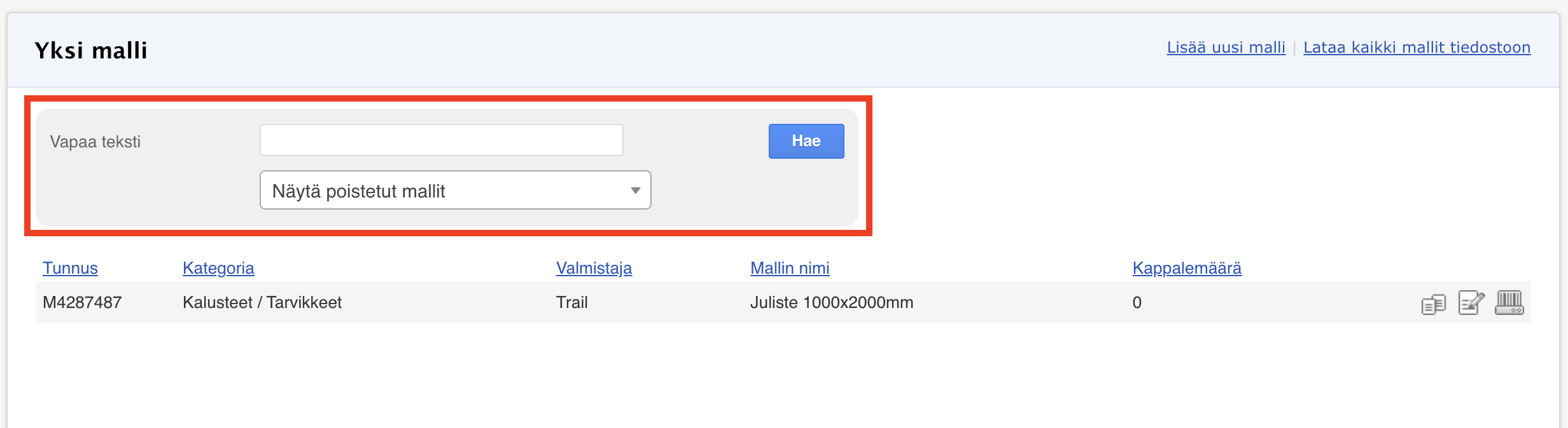 - Poistetut mallit löytyvät tarkennetun haun avulla.