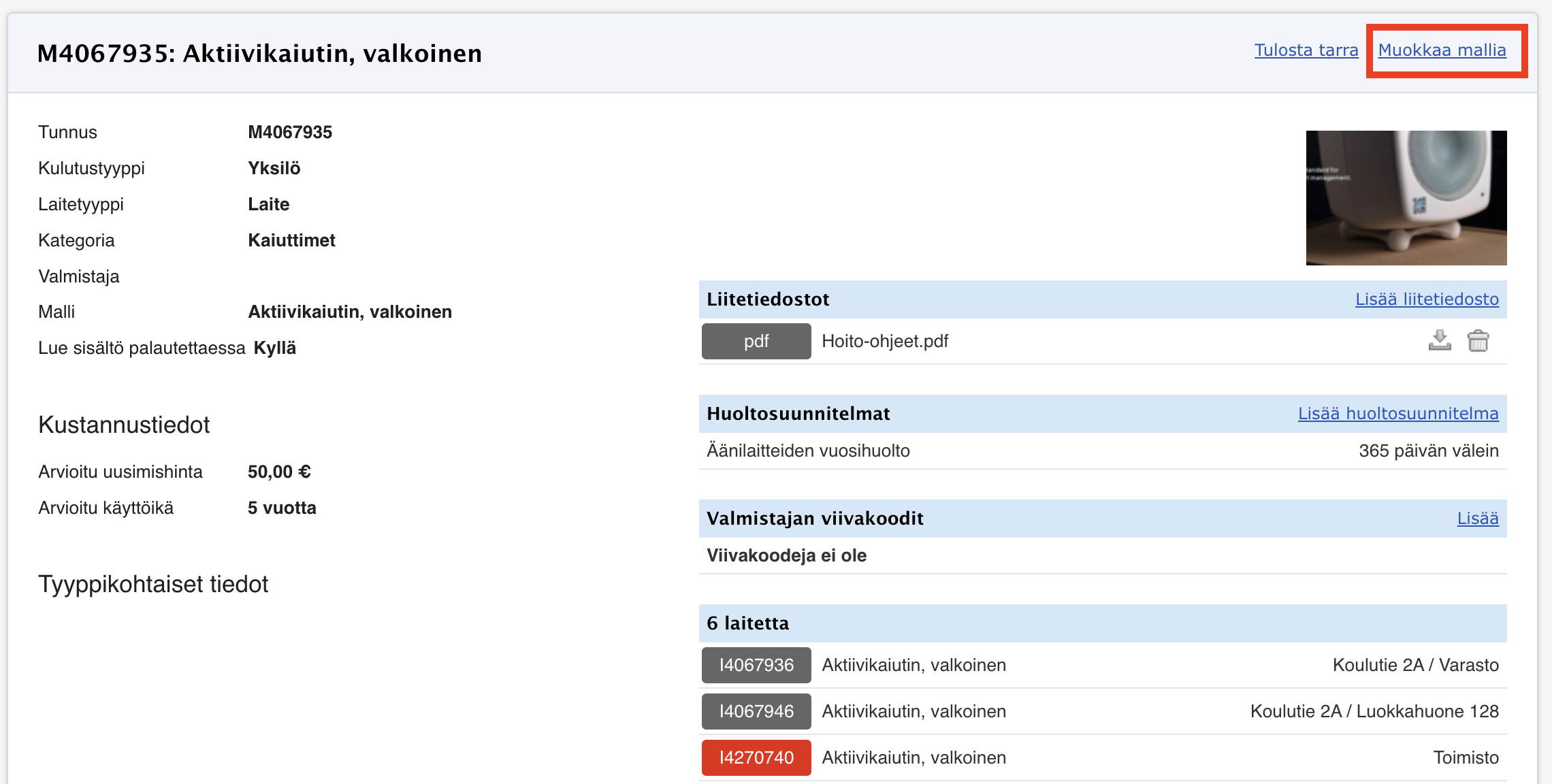 Laitemallit sivulta löytyy kaikki yksilölaitteiden mallit listattuna. Sivulta voi tarkistaa helposti kokonaistilanteen, muokata mallien tietoja, ja ladata raportin mallien perustiedoista.