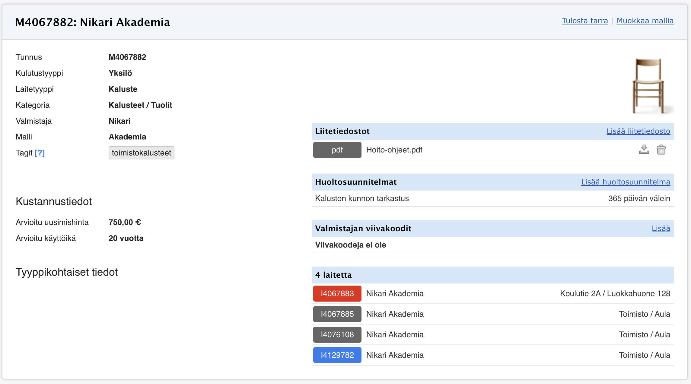 - Jokaisella laitteella on oma laitekortti, johon tallennetaan esimerkiksi sijainti, hankintatiedot sekä huolto- ja varaustiedot.