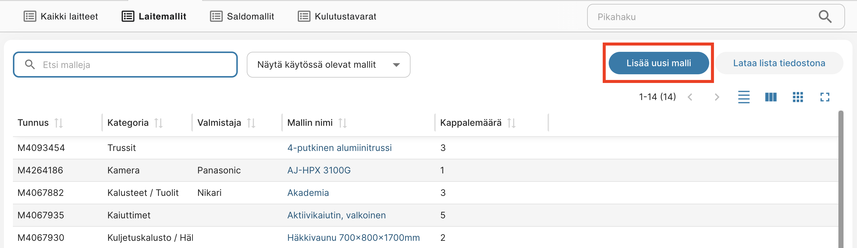 Tarvittaessa uuden mallin voi kuitenkin luoda etukäteen mallilistan kautta. Mallin luominen etukäteen helpottaa tietojen yhtenäistä määrittelyä, eli mallinimen oikea kirjoitustyyli, sekä oikean kategorian ja laitetyypin valitseminen valmiiksi.