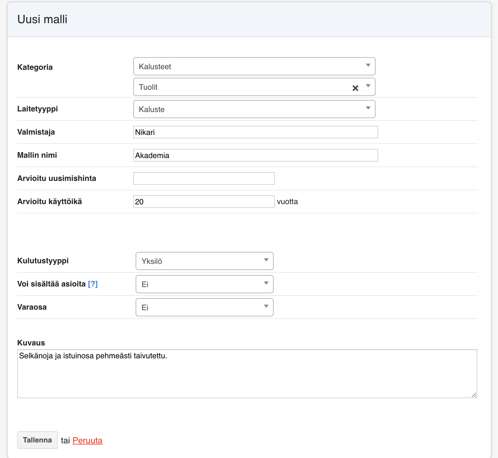- Malli tarkoittaa laitteen yleistä mallia (esim. Nikari Akademia tai Volvo V60).