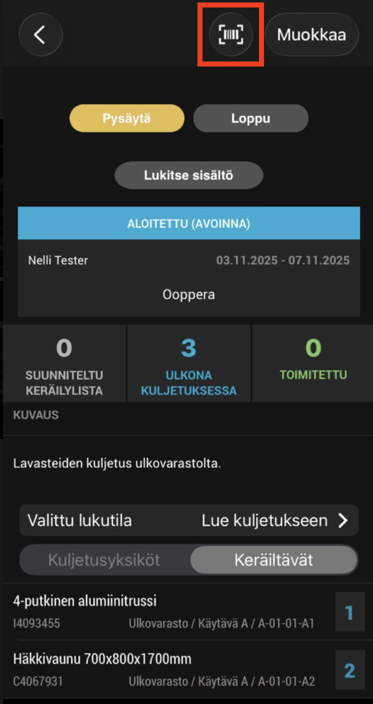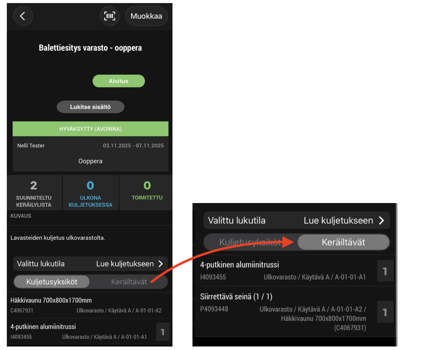 - Kun tuote on kerätty, se näkyy sinisellä kuljetusnäkymässä.