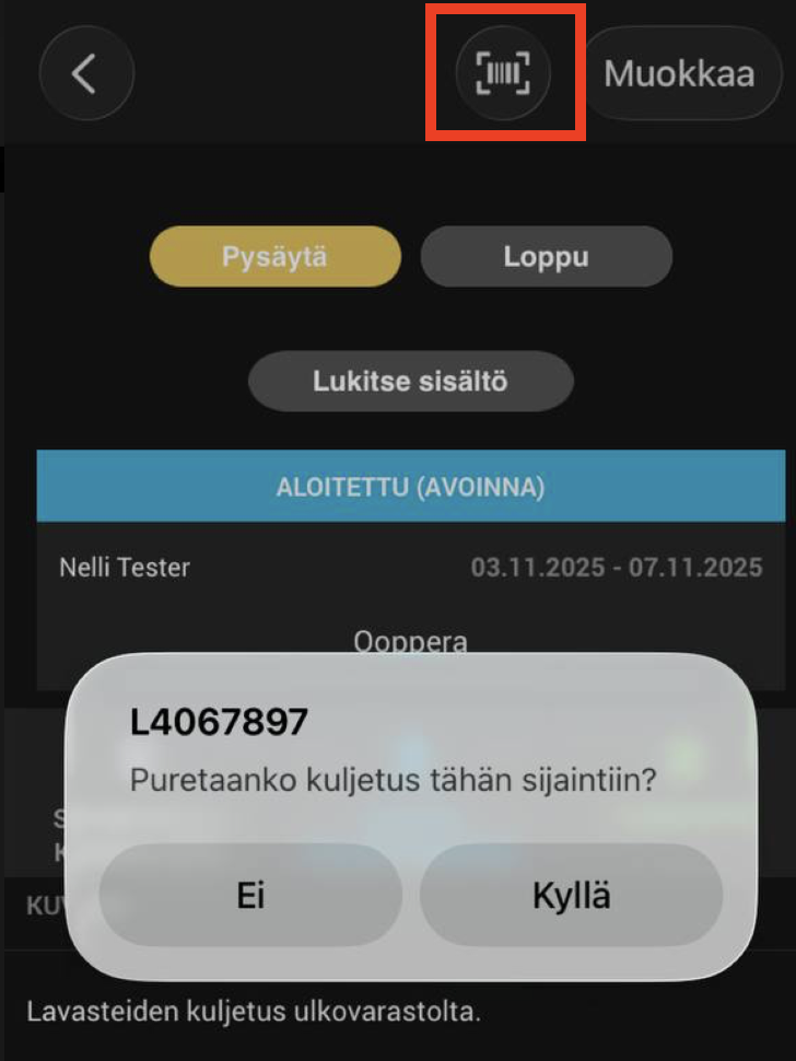 - Kun kuljetus on valmis, paina “Loppu” päättääksesi kuljetus kokonaan.