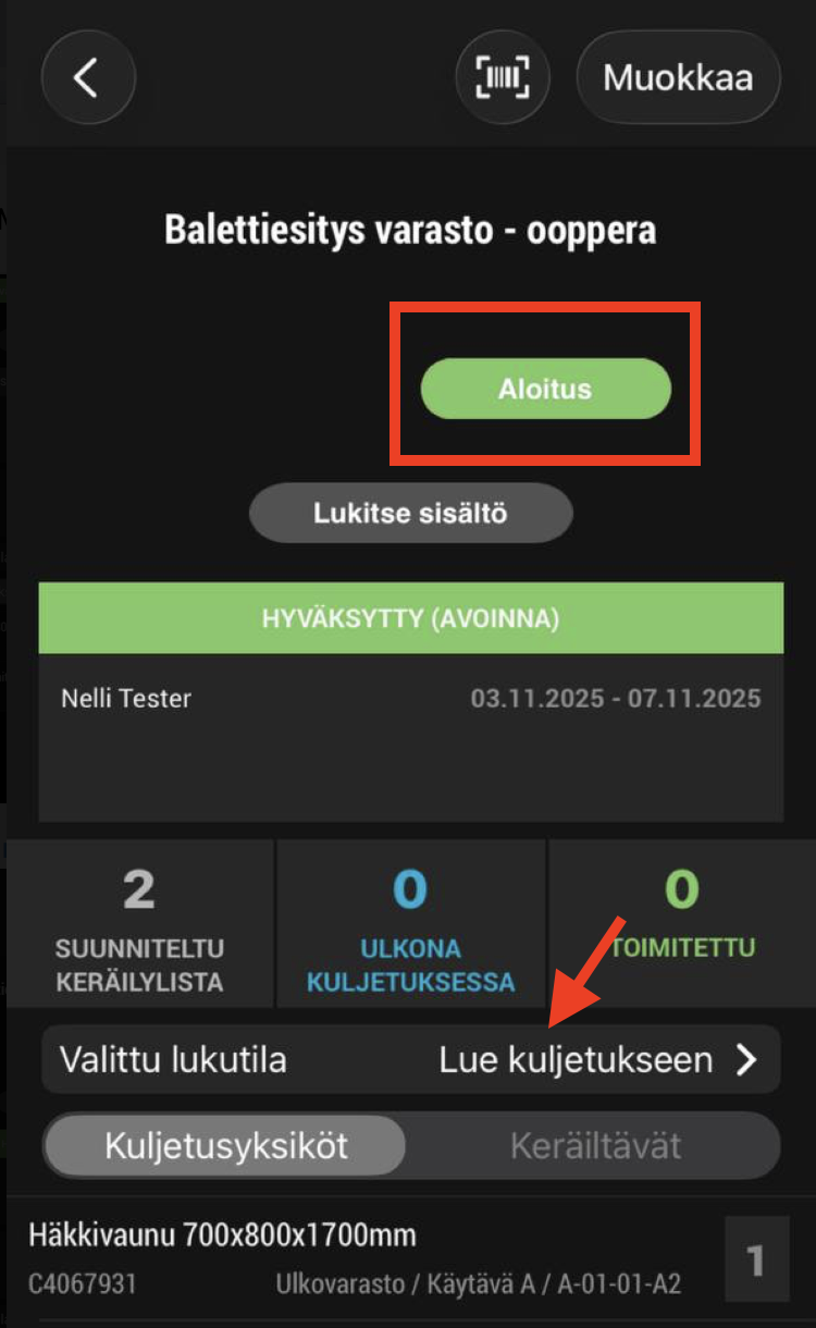 Aloituksen voi tehdä käyttäjä, jolla on vähintään lukutason oikeudet. Varmista, että Valittu lukutila on asetettu tilaan Lue kuljetukseen.