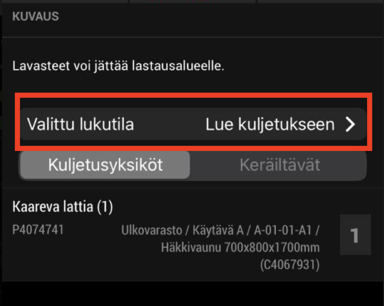 - Jos tuote on esimerkiksi häkkivaunussa, riittää häkkivaunun skannaaminen – tällöin kaikki sen sisältämät tuotteet siirtyvät kerralla kuljetukseen.