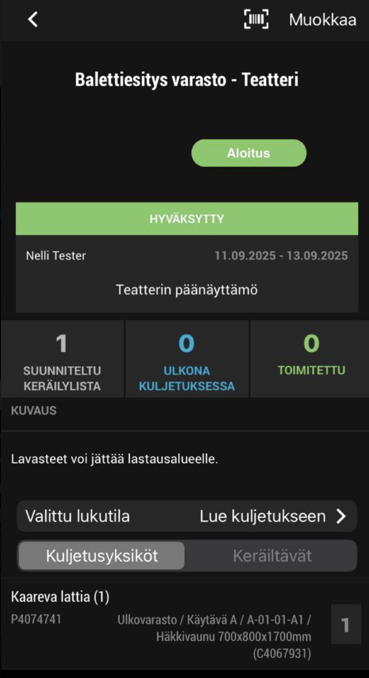 Kuljetuksen aloitus kohteessa