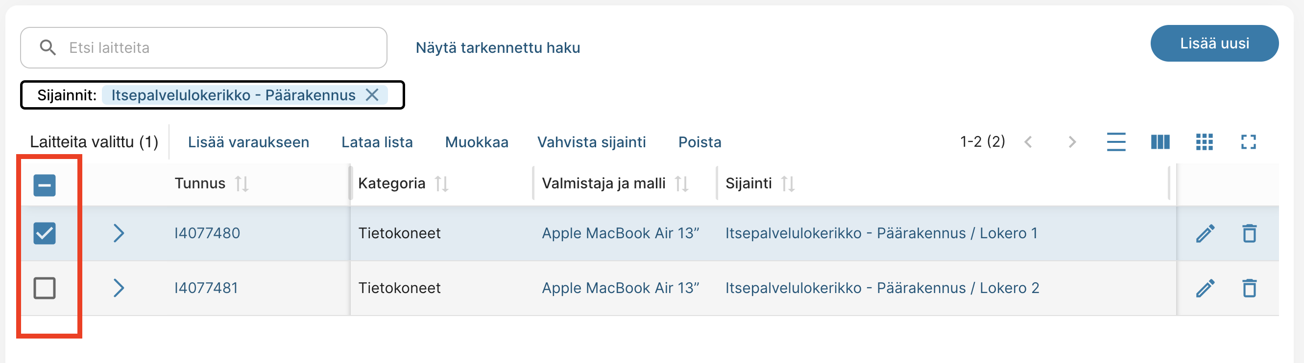 - Laitelistan sijainti -sarake näyttää mistä lokerosta laite löytyy.