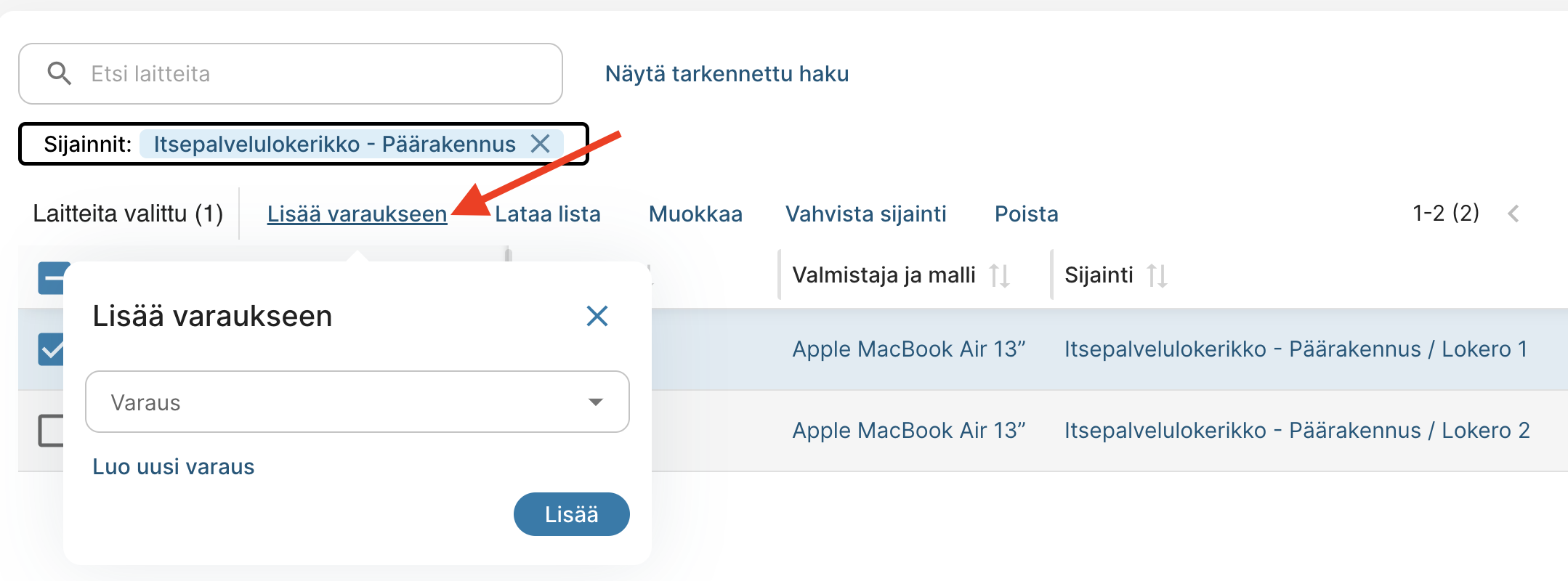 - Hae laitelistalta tarvitsemasi laite esimerkiksi sijainnin tai laitteen nimellä.