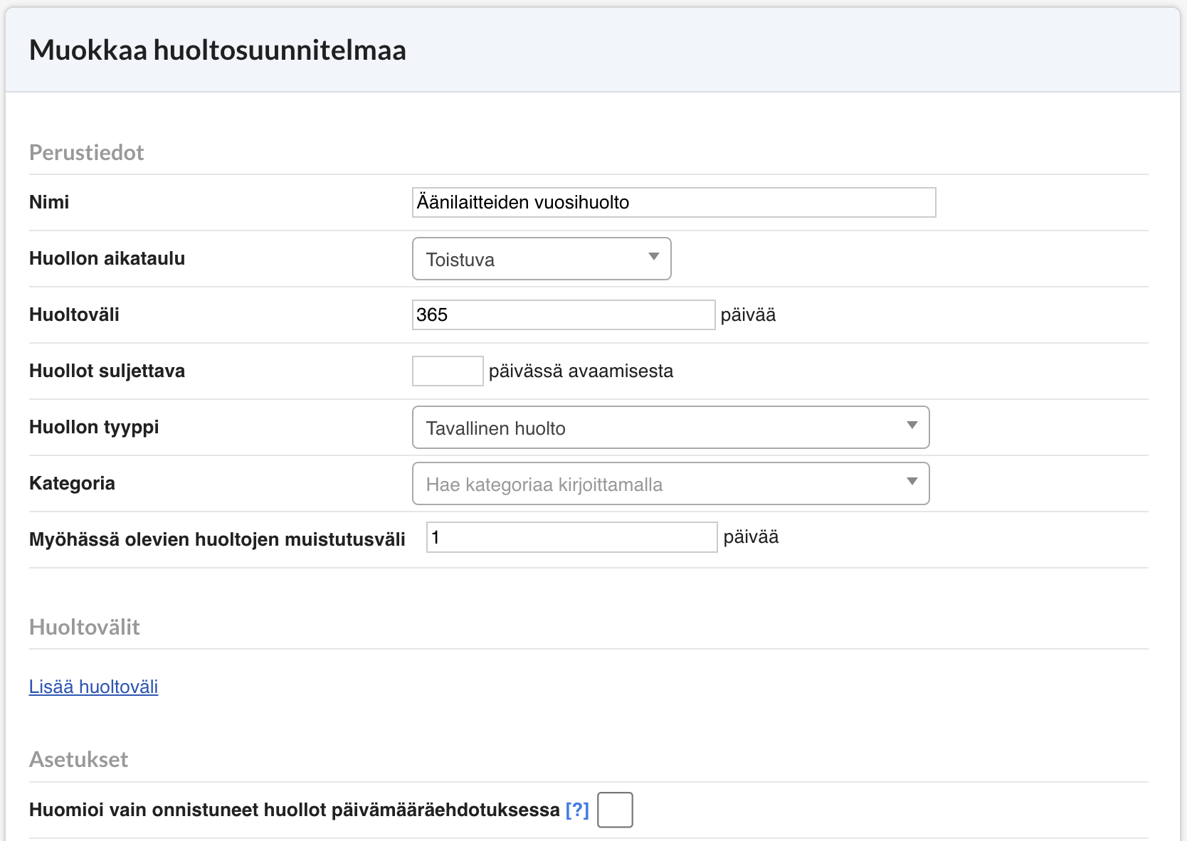 - Kategoria – Lisäasetus. Mahdollisuus ryhmittää huoltosuunnitelmia. (selitetty tarkemmin artikkelin lopussa)