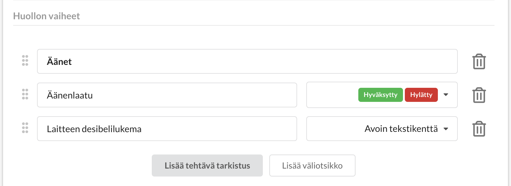 - Vaiheille voidaan asettaa: Hyväksytty; Hylätty; N/A; Avoin tekstikenttä (esim. mittaustuloksille)
