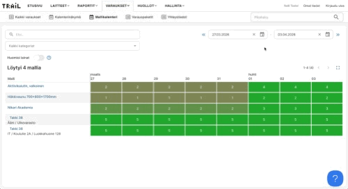 Mallikalenterin avulla voit tarkistaa, kuinka monta laitetta kustakin mallista on vapaana tiettynä ajankohtana.