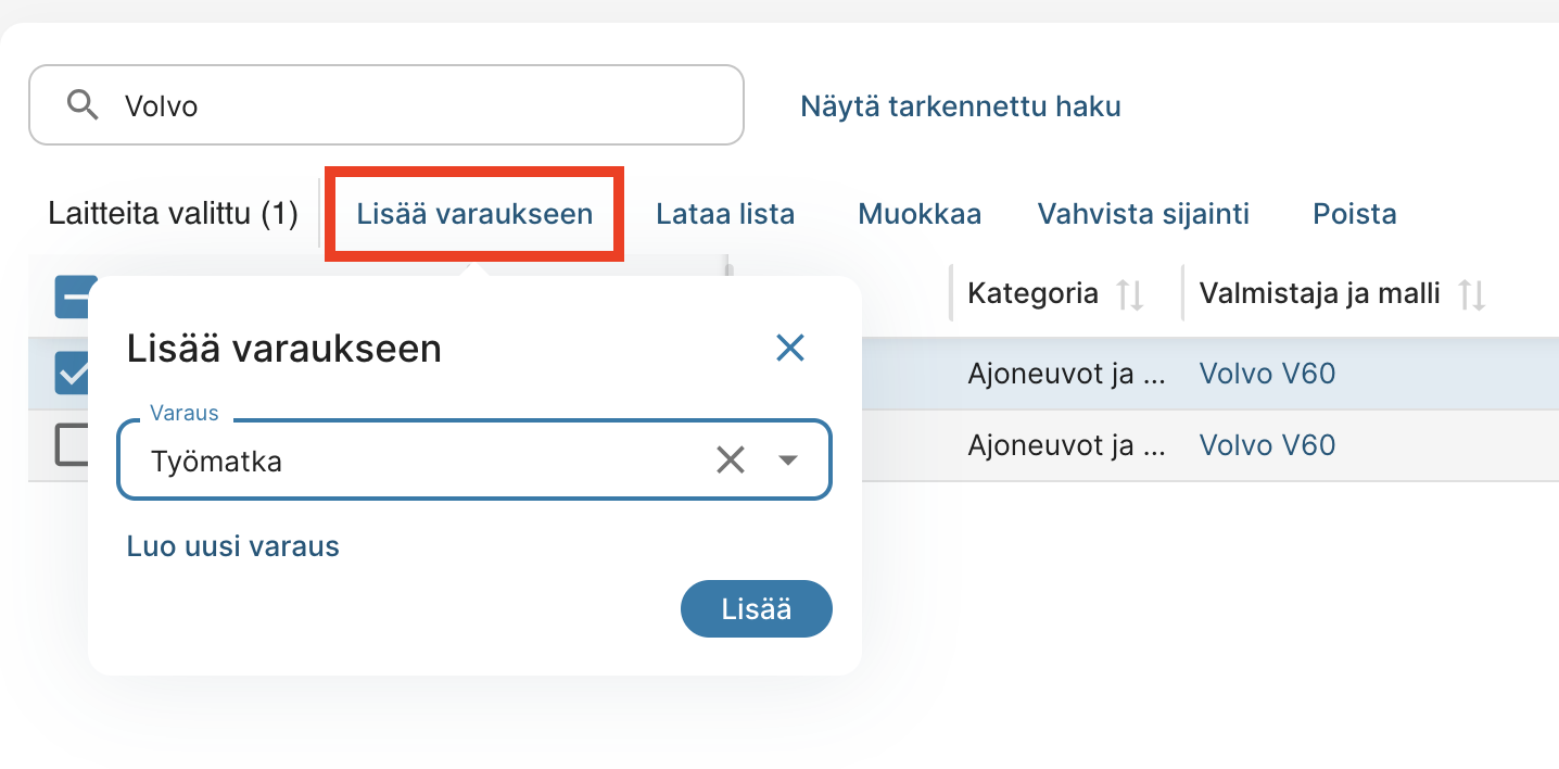 Tämä tapa on loistava silloin kun halutaan varmistaa, että tietty laiteyksilö on varmasti vapaana, -esimerkiksi ajoneuvo opetuskäyttöön tai työmatkalle.
