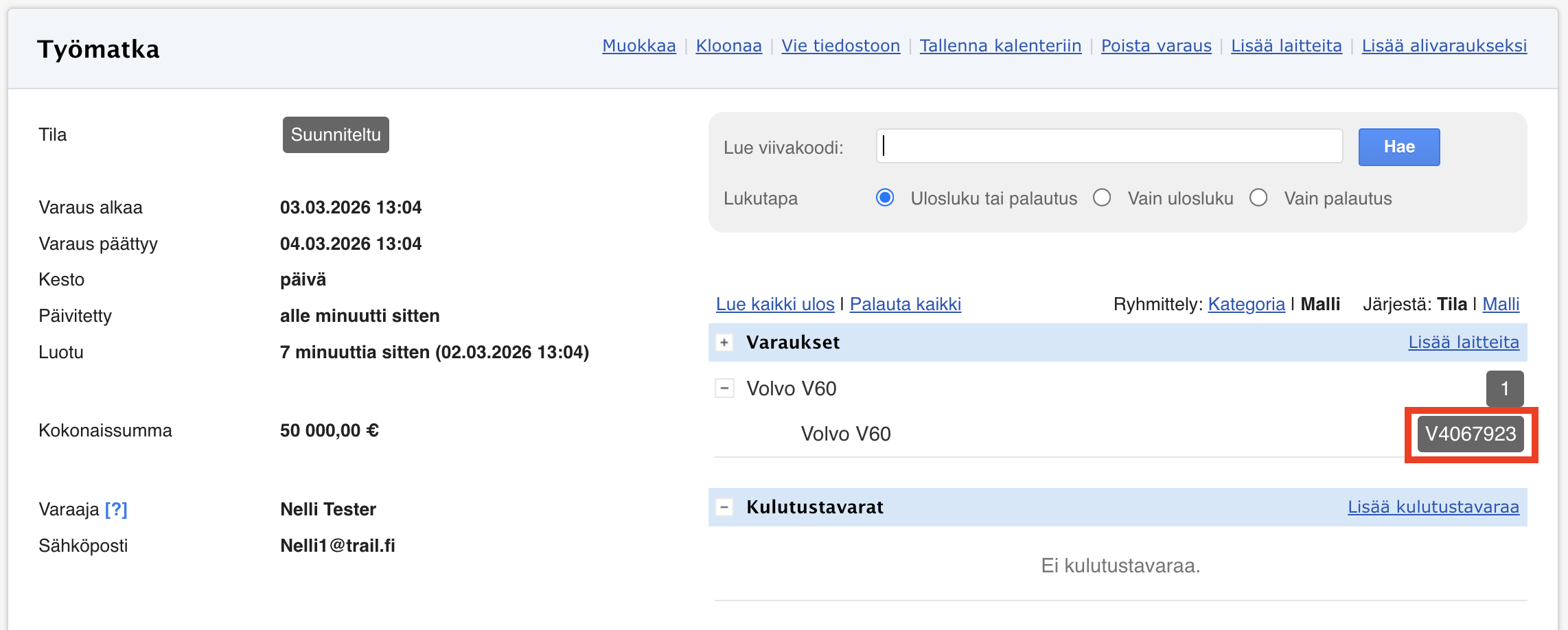 Vaihtoehtoisesti varaukseen voidaan lisätä tietty laiteyksilö jo suunnitteluvaiheessa. Tämä tarkoittaa, että varauksen alkaessa on luettava ulos juuri se laite, joka on suunniteltu varaukseen.