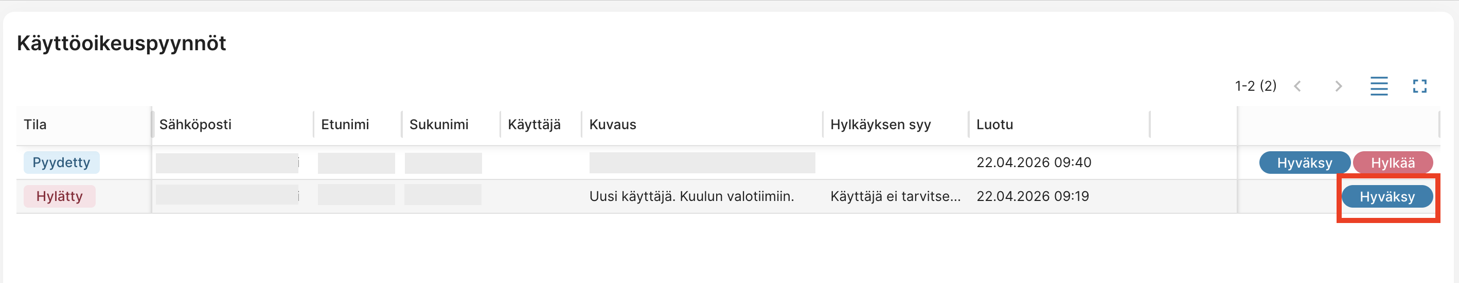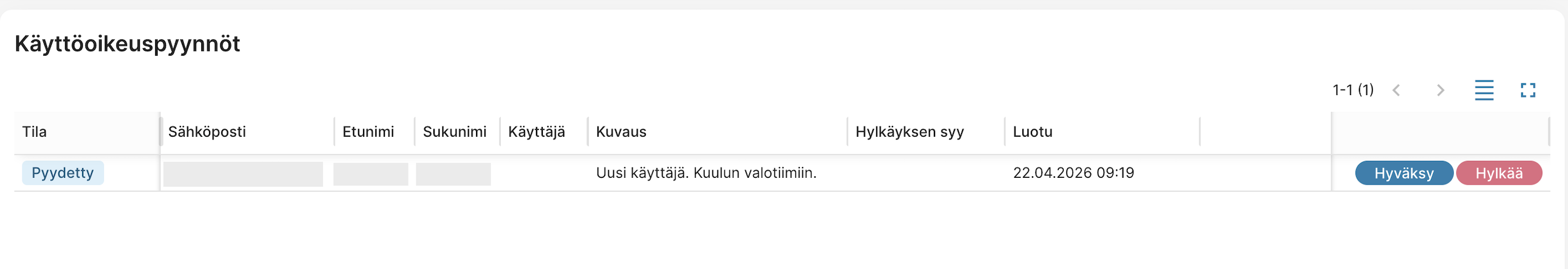 - Kaikki pyynnöt löytyvät myös Trailista: Hallinta → Käyttöoikeuspyynnöt