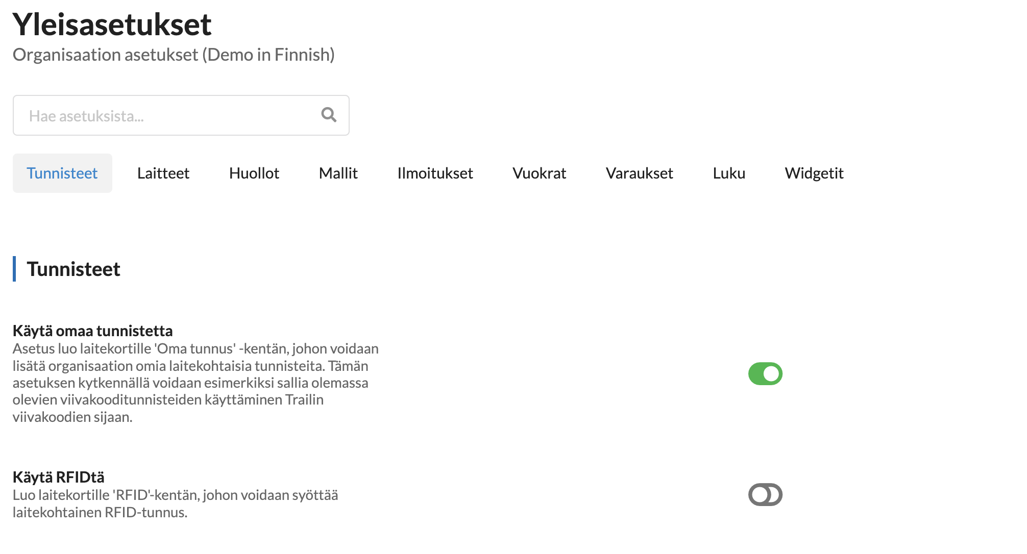 - Asetukset on jaettu näkymään aihealueittain. Esimerkiksi Tunnisteet, Laitteet, Huollot, Varaukset.