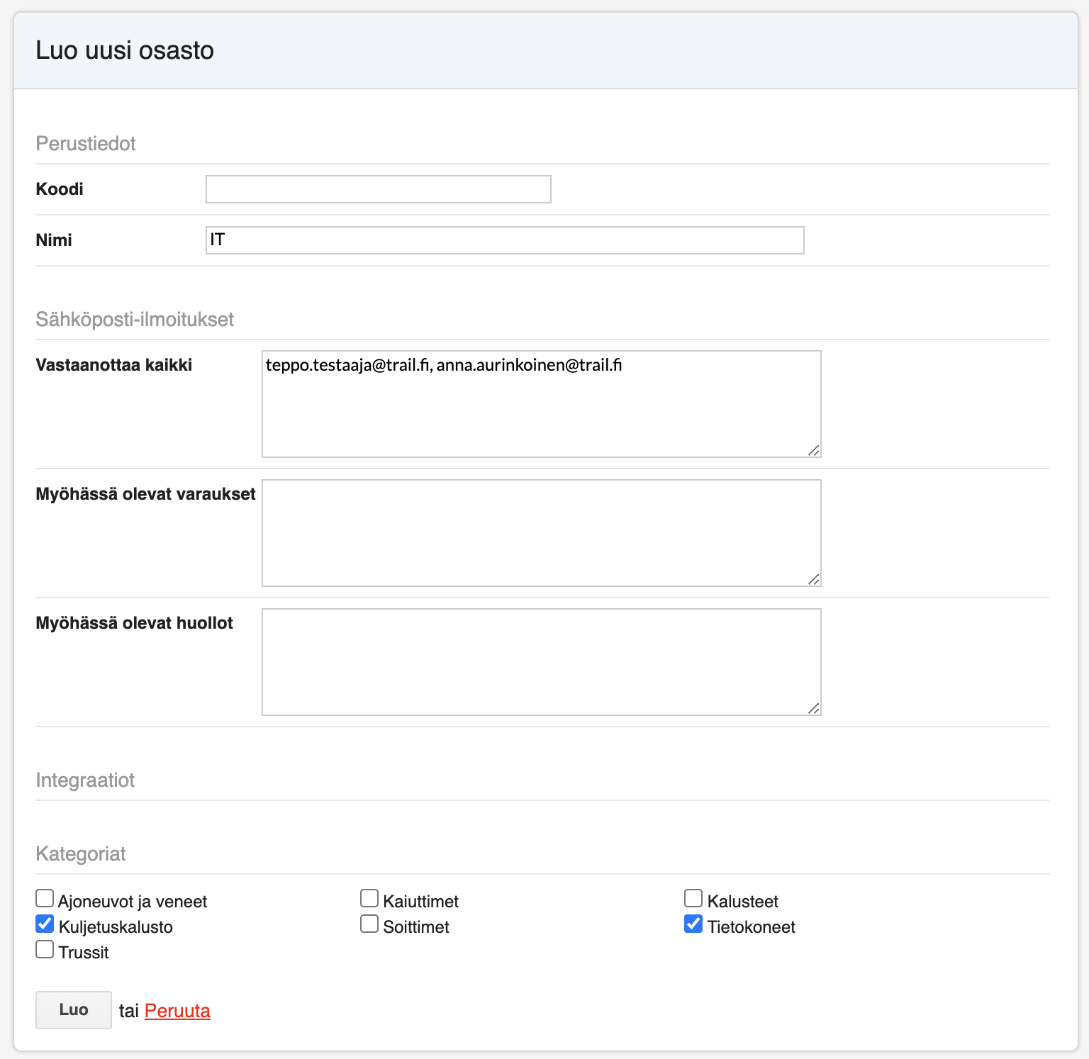 - Klikkaa Luo tallentaaksesi osaston.