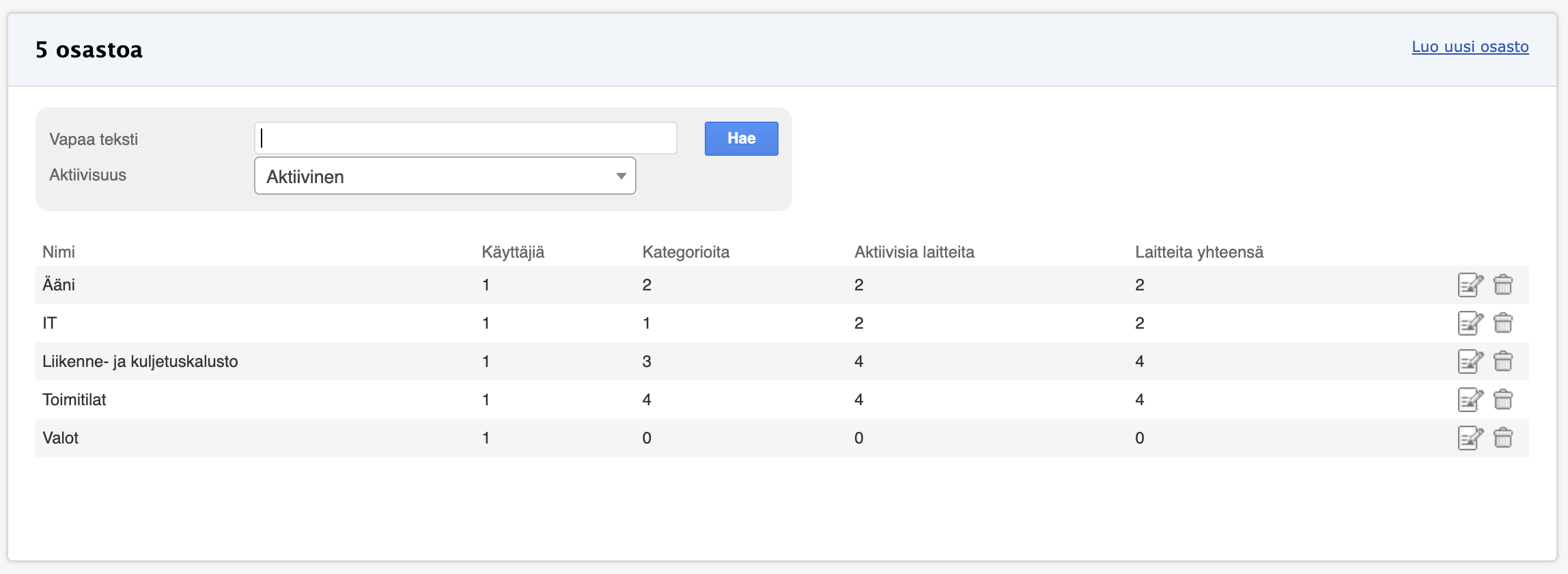 - Klikkaa osaston nimeä, tai muokkauskuvaketta, jolloin muokkausnäkymä aukeaa.