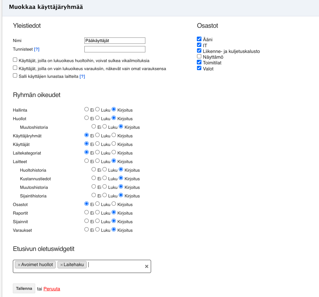 - Käyttäjäoikeudet, jotka ryhmän käyttäjille annetaan eri moduuleihin tai sivuihin